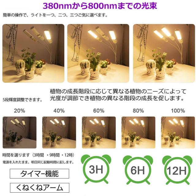 【タイミング機能】異なる植物のニーズに応じて、3時間、6時間または12時間の三つの時間設定モードがあります。時間を設定すれば、3時間・6時間・12時間後自動的に電源が切れます。サイクルタイマーによって、設定した時間通り、毎日自動的にON/OFF。毎日設置する必要はありません。お出かけるときにも使えます。