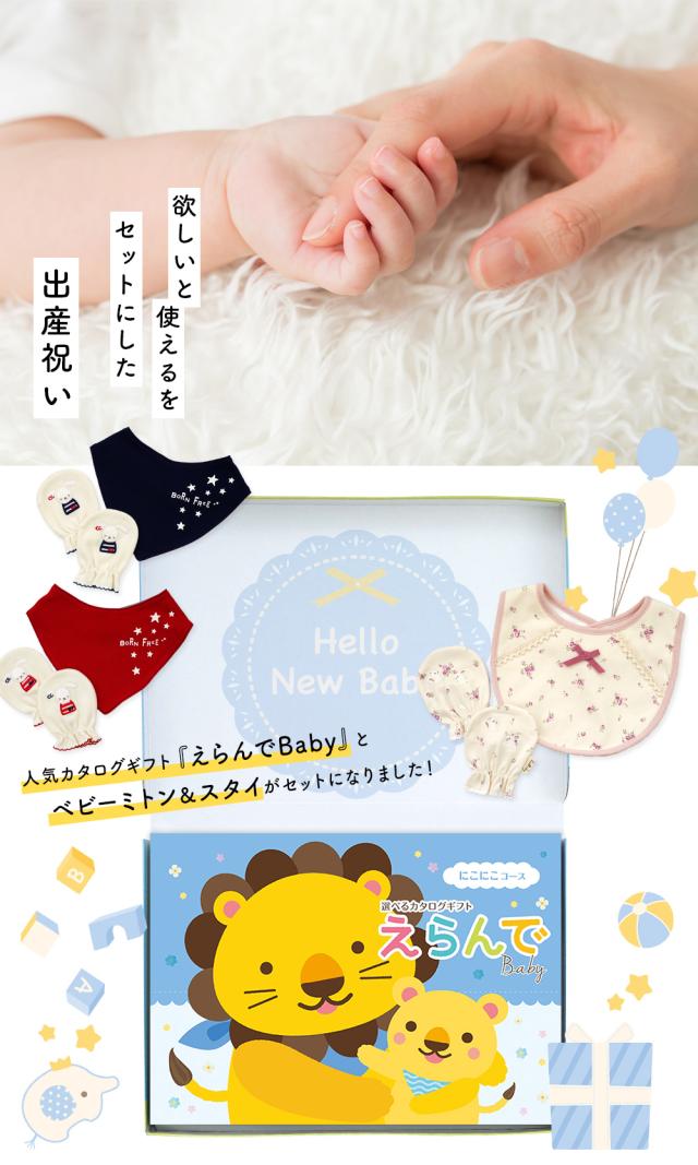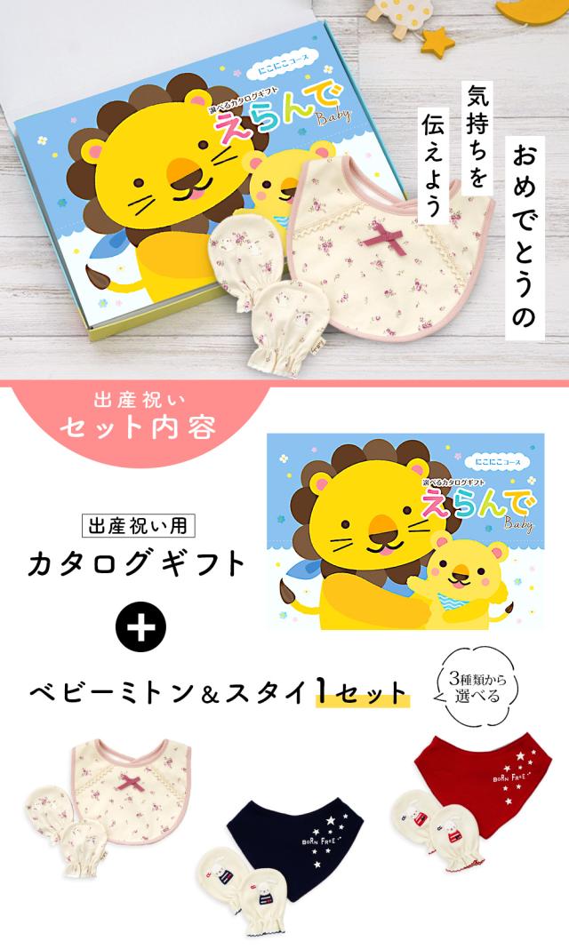 出産祝い カタログギフト えらんで にこにこコース & ミトン & スタイ セット<新作商品>【3点セット ビブ バンダナスタイ 3種から選べる ビセラ 日本製 国産 お祝い 男の子 女の子 赤ちゃん ベビー 綿 ギフトセット 出産 BE CERA】