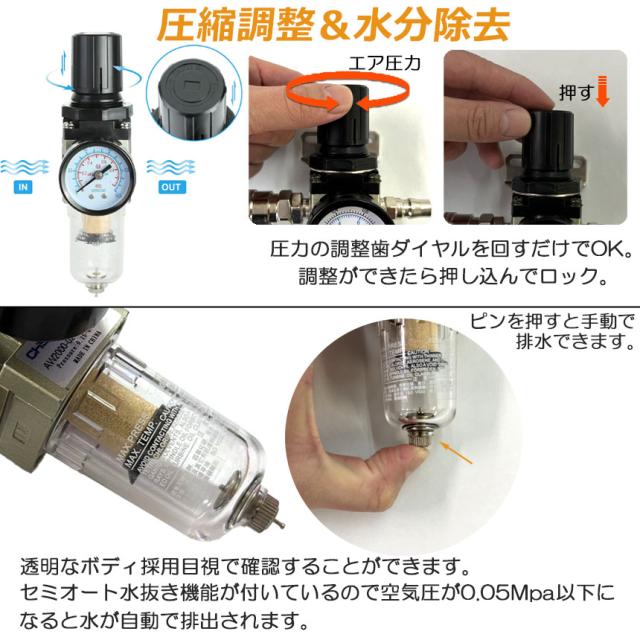【用途】エアーの水、オイル取り、圧力の調整をするためのエアーレギュレーターです。【アルミ削りだしボディ】レギュレーター本体は錆びないアルミ削りだし ボディを採用しているので錆びない、 軽量、 耐久性にとても 優れた商品となります。