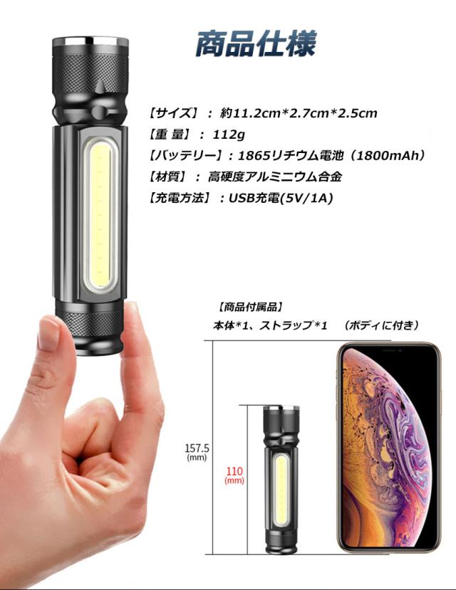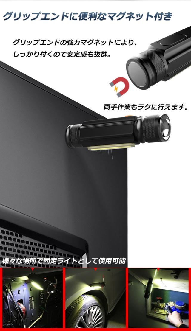 懐中電灯 LEDライト 充電式 ズーム付き 充電式 COBライト ハンドライト USB充電 ズーム 超強光 作業灯 ワークライト クリップ マグネット アルミ合金素材 小型 軽量 防災 防水