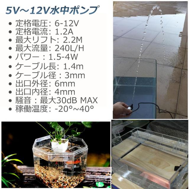 【商品仕様】DCコード(アダプター無し)、 作動電圧:DC6V〜12V、最大消費電力:4W。 最大吐出量:240L/H(揚程0mの場合)、最大揚程:2.2M、コードの長さ:1.4メートル。【水陸両用】水中ポンプは二つの水ノズルが設計されており、水中、あるいは陸上での使用可能も可能になります、製品分解可能です、お手入れの時も簡単です。
