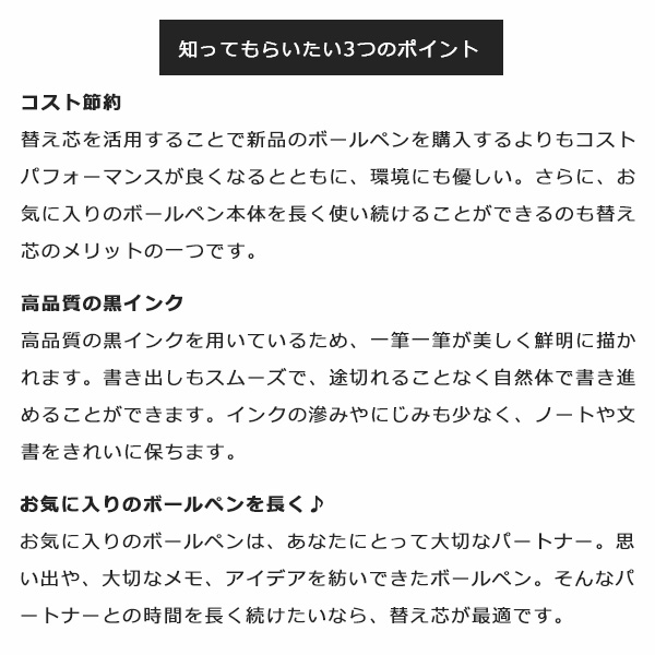 替え芯を活用することで新品のボールペンを購入するよりもコスト パフォーマンスが良くなるとともに、環境にも優しい。さらに、お 気に入りのボールペン本体を長く使い続けることができるのも替え 芯のメリットの一つです。