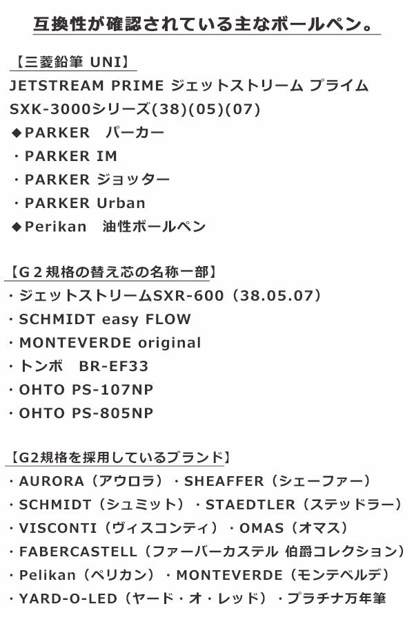 | 商品説明 | 【お気に入りのボールペンを長く使い続けられます】 お気に入りのボールペンは、あなたにとって大切なパートナー。あなたの思い出や、大切なメモ、アイデアを紡いできたボールペン。 そんなパートナーとの時間を長く続けたいなら、替え芯が最適です。 【コスト節約】 替え芯を活用することで新品のボールペンを購入するよりもコスト パフォーマンスが良くなるとともに、環境にも優しい。さらに、お 気に入りのボールペン本体を長く使い続けることができるのも替え 芯のメリットの一つです。 【高品質の黒インク】 高品質の黒インクを用いているため、一筆一筆が美しく鮮明に描か れます。書き出しもスムーズで、途切れることなく自然体で書き進 めることができます。インクの滲みやにじみも少なく、ノートや文 書をきれいに保ちます。 【お気に入りのボールペンを長く♪】 お気に入りのボールペンは、あなたにとって大切なパートナー。思 い出や、大切なメモ、アイデアを紡いできたボールペン。そんなパ ートナーとの時間を長く続けたいなら、替え芯が最適です。 【互換性】 互換性が確認されている主なボールペン。 ◆三菱鉛筆 UNI PARKER JETSTREAM PRIME ジェットストリーム プライム SXK-3000シリーズ(38)(05)(07) ◆PARKER パーカー ・PARKER IM ・PARKER ジョッター ・PARKER Urban ◆Perikan 油性ボールペン G2規格の替え芯の名称一部 ・ジェットストリームSXR-600(38.05.07) ・SCHMIDT easy FLOW ・MONTEVERDE original ・トンボ BR-EF33 ・OHTO PS-107NP ・OHTO PS-805NP G2規格を採用しているブランド ・AURORA(アウロラ)・SHEAFFER(シェーファー)・SCHMIDT(シュミット) ・STAEDTLER(ステッドラー)・VISCONTI(ヴィスコンティ)・OMAS(オマス) ・FABERCASTELL(ファーバーカステル 伯爵コレクション)・Pelikan(ペリカン) ・MONTEVERDE(モンテベルデ)・YARD-O-LED(ヤード・オ・レッド)・プラチナ万年筆 【注意事項】 ※本商品には説明書が付属しておりません。使用方法に関しては商品ページをご参照ください。 ※商品画像はご覧になっているモニターやPCなどの環境、解像度により、実物と多少カラーが異なる場合がございます。色味やサイズが異なるなどのクレームはご対応致しかねますので、予めご了承ください。 ※輸送中に外装に傷やへこみが起こる場合がございますが、商品に影響はございませんので、予めご了承のもとお買い求めください。 ※本商品は海外からの輸入品ですので、細かい傷や汚れなどある場合がございます。予めご了承のもとお買い求めください。 ※こちらの商品は安価にご提供するため、簡易包装、簡易パッケージとなっております。 ※本商品を使用した事による、直接もしくは間接的に生じた損害、事故、怪我について当店は一切の責任を負いません。 ※本商品を使用する際は、周りに色が付くものは置かないでください。また直接床などで使用しますと、床に傷が付いたり、色移りする場合がございます。予めご了承のもと、ご使用ください。 ※本商品は芯が尖っており、先端などで怪我をする可能性がございますので、お取り扱い時は十分に注意してご使用ください。 ※お子様がご利用になる場合は大人の方と一緒にご使用頂き、お子様の手の届かない場所で保管してください。 |