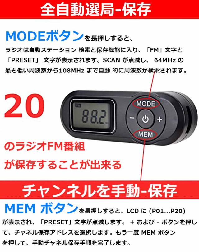 【ワイドFMラジオ】抜群なチップを採用し、20個のラジオFM番組が保存でき、たくさんのラジオ番組を楽しむことができます!プリセット選局方法は下記二つあります:全自動選局して保存する(ATS機能)、手動でチャンネル保存する。更にチャンネル選定方法は下記三つあります:手動選局、自動選局、全自動選局して保存する(ATS機能)、操作がとても便利です。