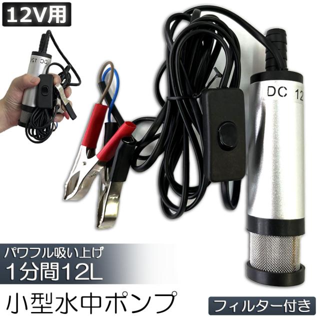 【商品仕様】:ON/OFFスイッチ付き 高さ:約16cm ポンプ直径:約38mm 吐出口径:約16mm ケーブル全長:約3m 吐出量:約12L/min 揚程:2m 電圧:DC-12V 電流:1.5A 接続方式:クランプ(ワニ口クリップ) 材質:ステンレス 適用範囲:ディーゼル、水、灯油、オイル等