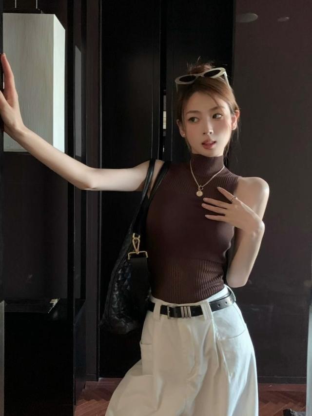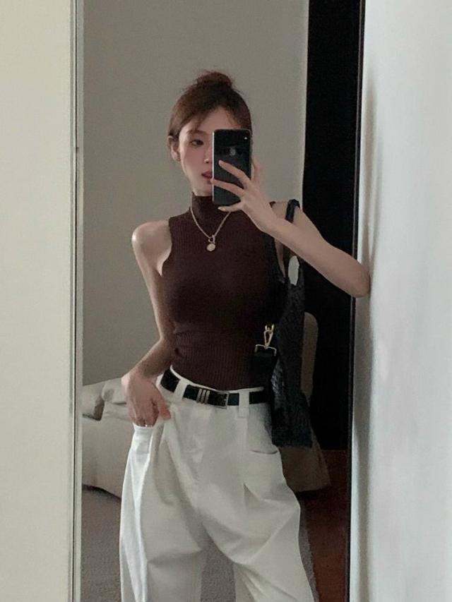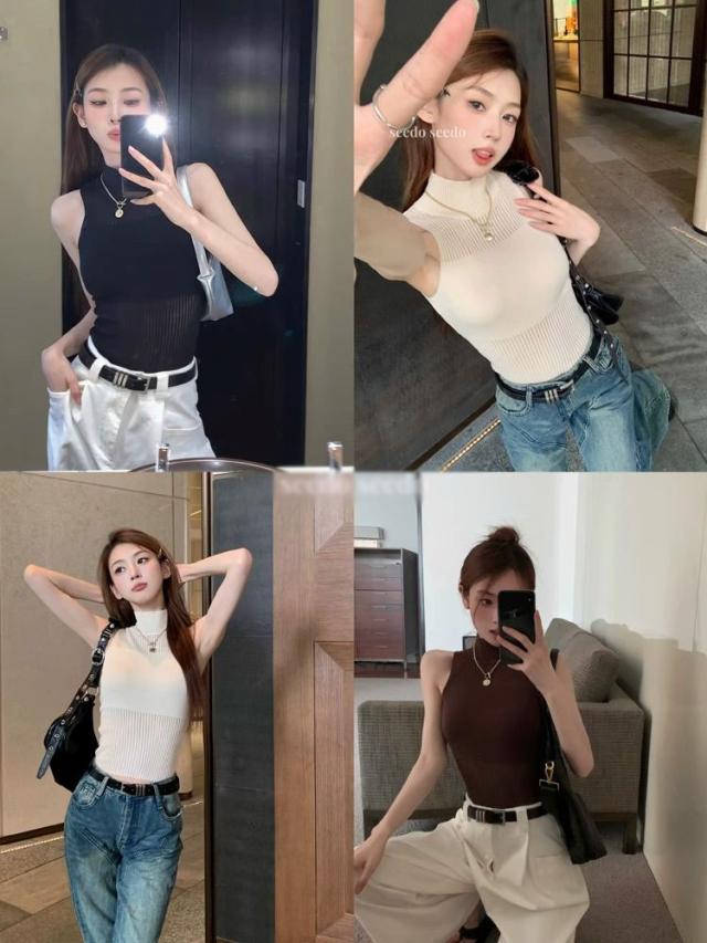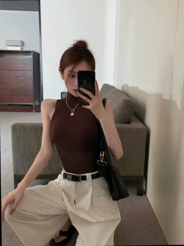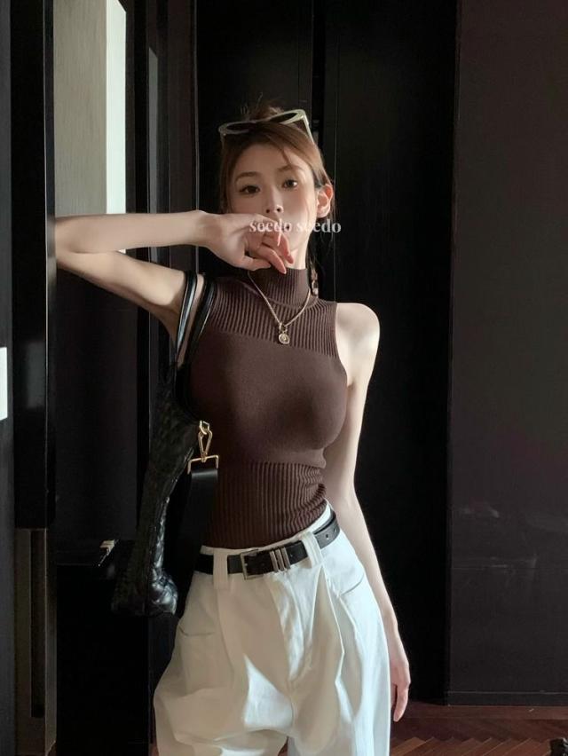 送料無料 サマーニット ノースリーブ レディース ハイネック トップス シースルー 夏 リブニット 薄手 カットソー タンクトップ キャミソール 無地 リブ編み 肌着 通勤