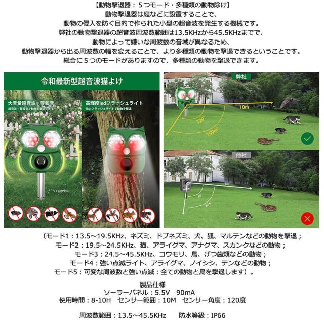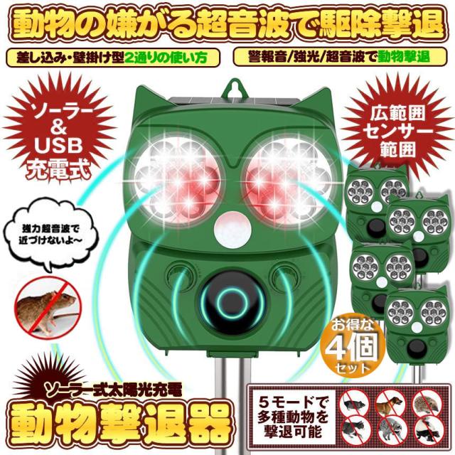 動物撃退器 害獣撃退器 超音波 フラッシュライト 4個セット 警報音 広範囲 センサー ソーラー 太陽光 USB充電式 防水 5モード 猫 鳥 ネズミ 犬 害獣 よけ 簡単 設置 ガーデン 畑 家庭菜園 キャンプ 登山 エコ 省エネ