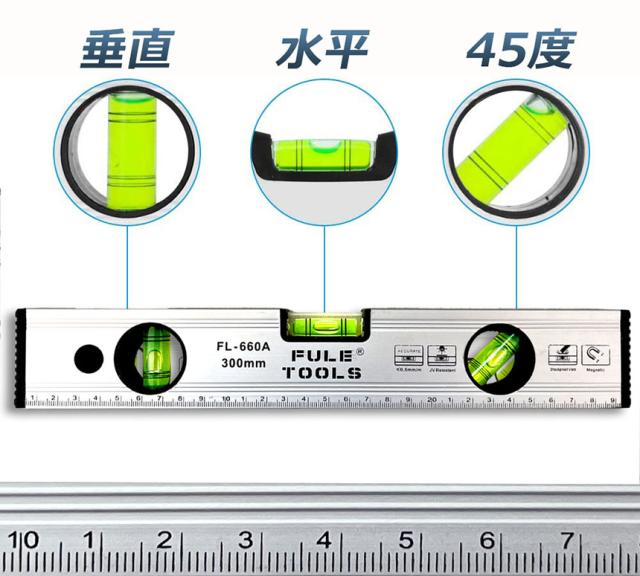 【 水平器 】 水平器は棚の取り付けや、レンガやブロックなどを積む際に地面に対して水平になっているかを確認するための道具です。水平ではない棚は危ないですし、レンガも途中で傾いて積むと見栄えが悪いだけでなく、修復の際も非常に面倒なことになります。そのため、水平器は「精度」が非常に重要です。本製品は耐久性の強いアルミ製を採用しているため、温度の影響受けにくい仕様となっております。また、そのほかにも変形しない・寿命が長いことが特徴となっております。【 3方向の角度計測に対応! 】 一般的な水平器は、「水平と垂直」の2方向のみ計測できるタイプが多いですが、本製品は、地面に対する角度を「水平・垂直・斜め45度」の3方向で計測可能なモデルとなっております。3方向計測できることで、幅広い箇所に対応しており、その結果、作業効率が良くなります。