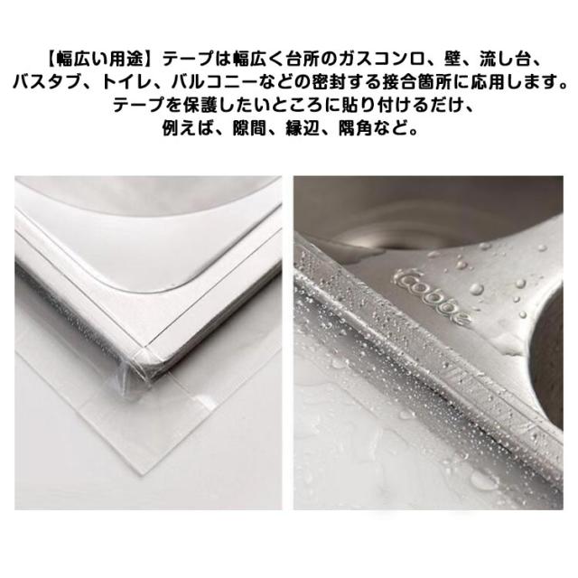 | 【幅広い用途】テープは幅広く台所のガスコンロ、壁、流し台、バスタブ、トイレ、バルコニーなどの密封する接合箇所に応用します。 テープを保護したいところに貼り付けるだけ、例えば、隙間、縁辺、隅角など。 【防水&防カビ】テープの表面には防水のPVC素材を採用しており、撥水加工で防水性に優れていて、便器や浴槽などの縁に水を遮断できます。そして、優れた防カビ機能が付き、カビが生えやすいところにも目覚ましく良い効果があります。隅々の水や汚れ、カビ、埃などを防げますし、バスルームや台所のカビによった悩みも解決できます、大安心。本製品をご利用した後、ご家庭雰囲気は新しくなれるでしょう。カビやほこりなどのことはもう心配せずに済みます。 【使用簡単 】普通のテープのように、貼りたいところを貼れば良いです。長さもお好きなようにカットできます。貼る前に埃や汚れを掃除すれば、粘着力と耐久性が更にアップできます。強力ですが、交換しやすいです。 【高品質 環境に優しい】高品質のアクリル素材を採用して、環境に優しくて実用性が高いです。無毒素材なので、子供やペットにも安全で、キッチンやお部屋などの場合で適用しています。粘着力強くて、長時間保つことができます。 | |