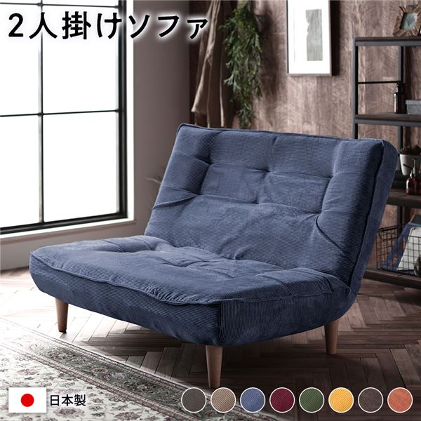 商品仕様: ハイバック ソファー 〔 2人掛け コーデュロイ生地 ブルー 青 〕 脚部:ナチュラル リクライニング 日本製