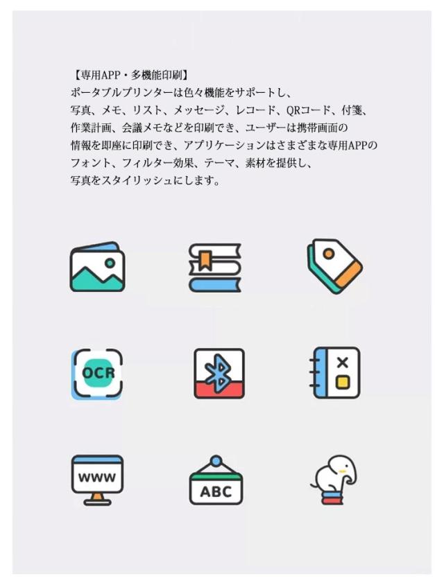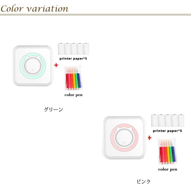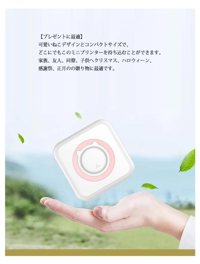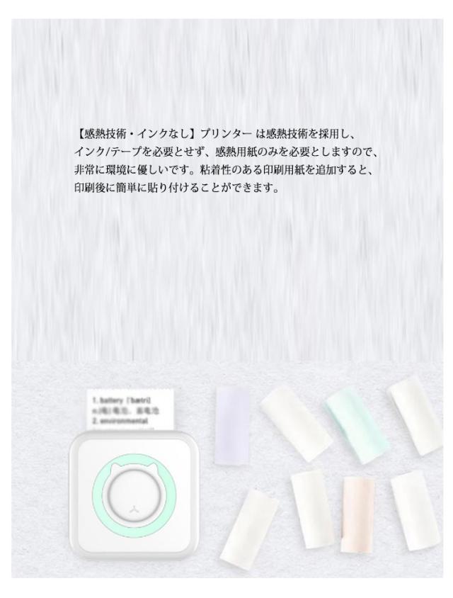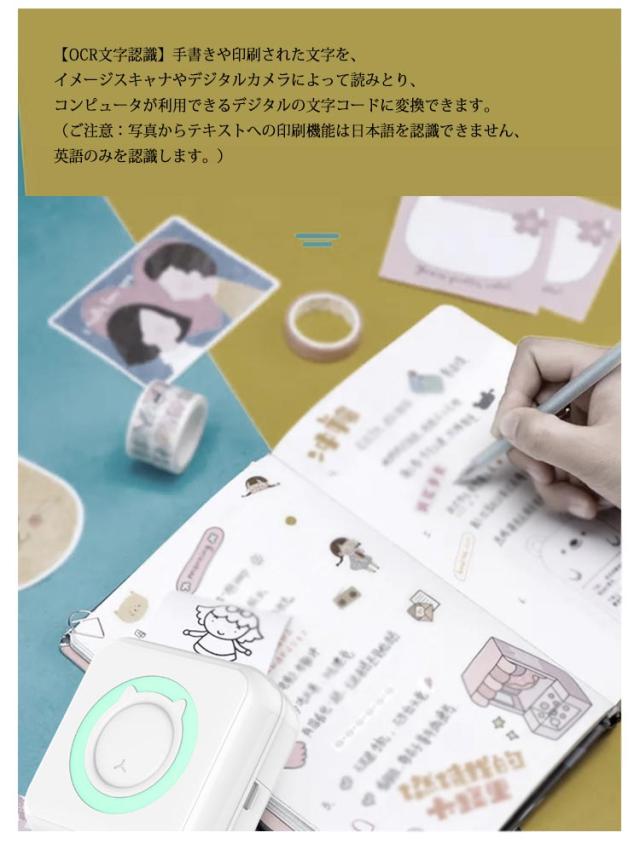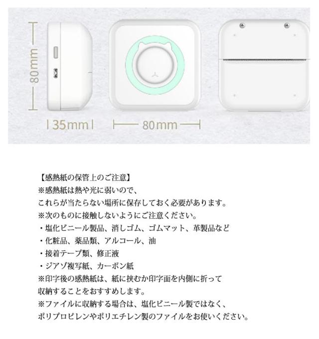 | 【Bluetooth接続・コード不要】サーマルプリンターはワイヤー不要で、スマホはBluetoothでアプリに直接接続できます。スマホで撮った写真をいつでも気軽にカンタンプリント!(システム対応:android 4.0とIOS8.0以上) 【専用APP・多機能印刷】ポータブルプリンターは色々機能をサポートし、写真、メモ、リスト、メッセージ、レコード、QRコード、付箋、作業計画、会議メモなどを印刷でき、ユーザーは携帯画面の情報を即座に印刷でき、アプリケーションはさまざまな専用APPのフォント、フィルター効果、テーマ、素材を提供し、写真をスタイリッシュにします。 【クリアな解像度】200dpi解像度を内蔵し、クリアでキレイな印刷効果を提供します。新しい画像とテキストの印刷エクスペリエンスをもたらし、白黒写真の印刷では、会議後にメモを取るのに適しています。写真、メモ、付箋、作業計画、会議メモなどにも使用できます。 【OCR文字認識】手書きや印刷された文字を、イメージスキャナやデジタルカメラによって読みとり、コンピュータが利用できるデジタルの文字コードに変換できます。(ご注意:写真からテキストへの印刷機能は日本語を認識できません、英語のみを認識します。) 【感熱技術・インクなし】プリンター は感熱技術を採用し、インク/テープを必要とせず、感熱用紙のみを必要としますので、非常に環境に優しいです。粘着性のある印刷用紙を追加すると、印刷後に簡単に貼り付けることができます。 【プレゼントに最適】可愛いねこデザインとコンパクトサイズで、どこにでもこのミニプリンターを持ち込むことができます。家族、友人、同僚、子供へクリスマス、ハロウィーン、感謝祭、正月のの贈り物に最適です。 【感熱紙の保管上のご注意】 ※感熱紙は熱や光に弱いので、これらが当たらない場所に保存しておく必要があります。 ※次のものに接触しないようにご注意ください。 ・塩化ビニール製品、消しゴム、ゴムマット、革製品など ・化粧品、薬品類、アルコール、油 ・接着テープ類、修正液 ・ジアゾ複写紙、カーボン紙 ※印字後の感熱紙は、紙に挟むか印字面を内側に折って収納することをおすすめします。 ※ファイルに収納する場合は、塩化ビニール製ではなく、ポリプロピレンやポリエチレン製のファイルをお使いください。 | |