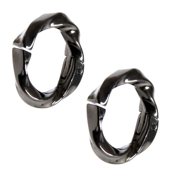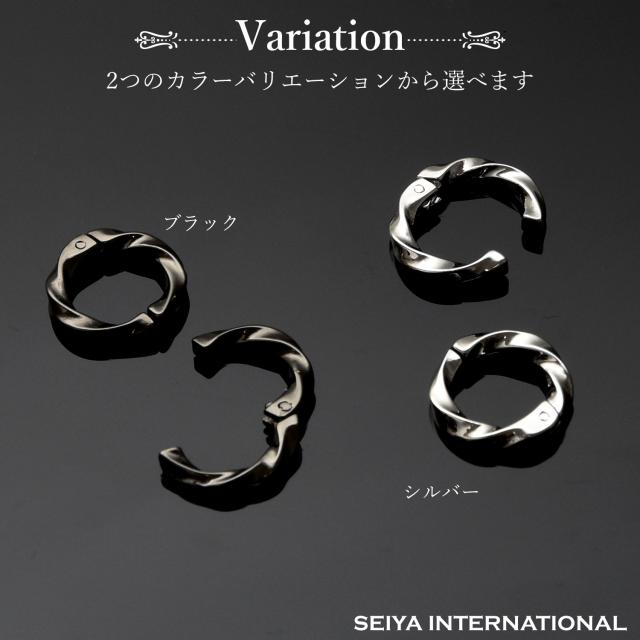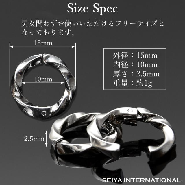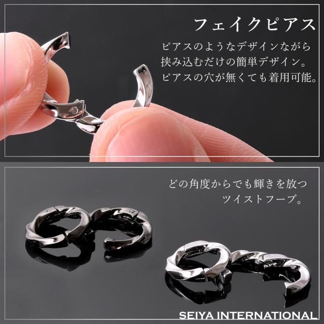 ■【 おしゃれなデザイン 】フープタイプにツイスト(ねじり)を加えどの角度から見てもキラキラと高級感のある輝きを放つツイストフープイヤリング、シンプルなフェイクピアスに飽きてしまった方や周りと差をつけたい方におすすめのアクセサリーです。ツイストフープフェイクピアスはメンズだけではなく、レディースにもお使いいただけます。光の反射により輝きを放ち、ねじりを効かせたデザインがあなたの耳元をおしゃれに演出します。耳に直接触れる部分は耳への負担が少なく外れにくい平らなフラット加工をしております。フープイヤリングのサイズは外径14mm 内径10mmフープイヤリングの厚さは約2mm 重さは約1グラムになります。カラーはシルバー ブラックからお選びください。