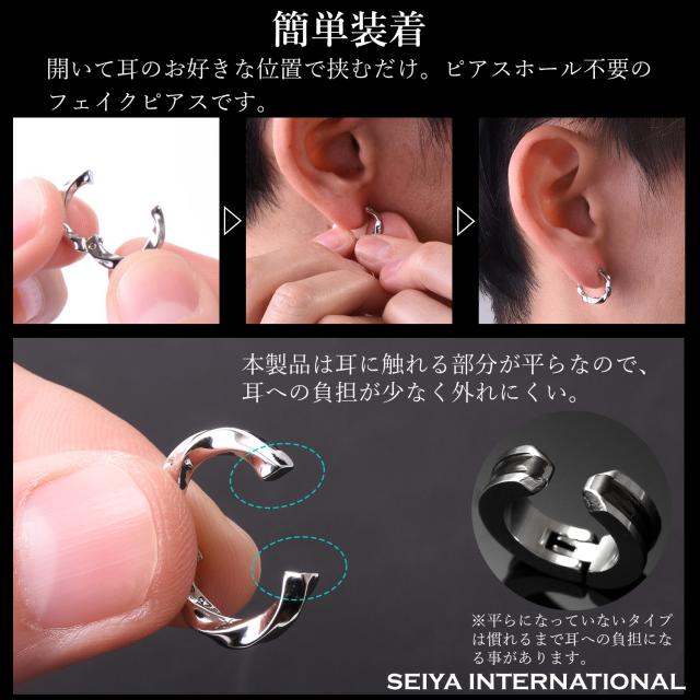 ■【 ばれないフェイクピアス 】フェイクピアスにはバネ式スプリングで耳に挟んで着用するタイプがあり、落としにくく人気のタイプです。しかし、後ろから見ると留め具が見えてしまい、フェイクピアスなのがばれてしまいがちです。こちらのフェイクピアスは耳の厚さに合わせて挟む強さを自分自身で調節ができるタイプなので好みの強さで調節ができ、留め具もないので前から見ても後ろから見てもフープピアスを装着しているようにみえます。