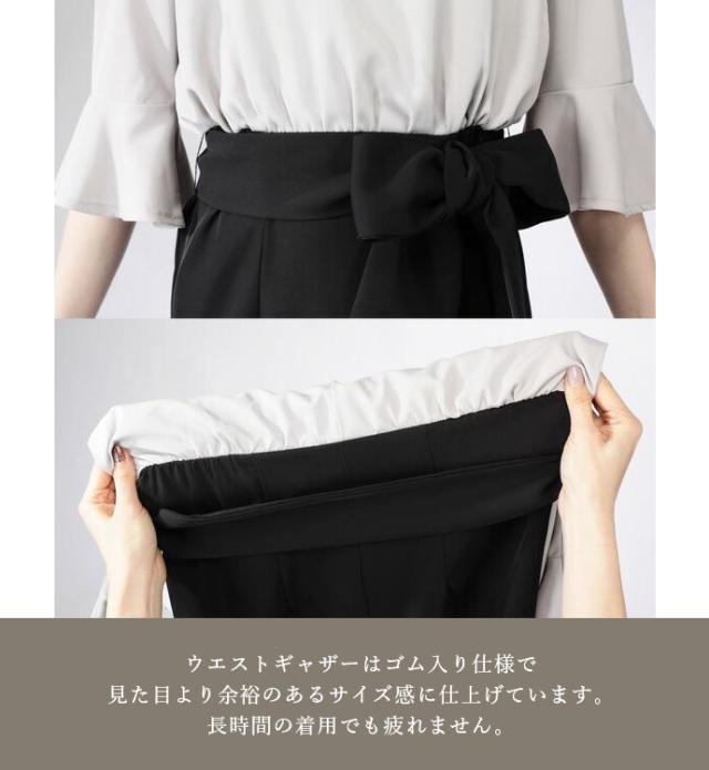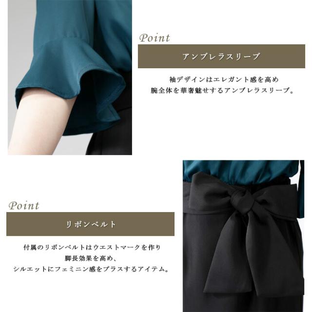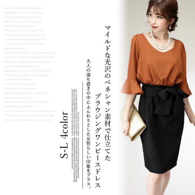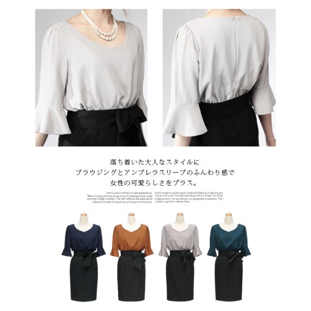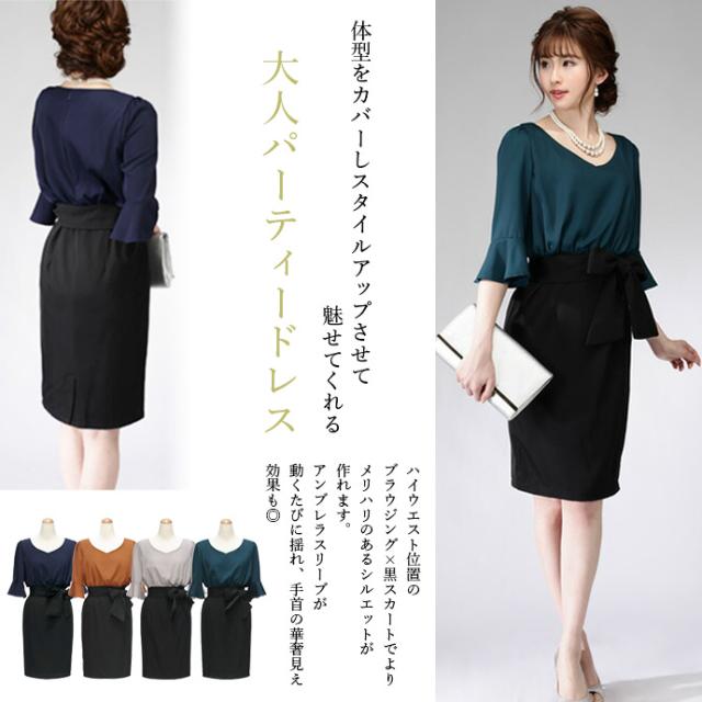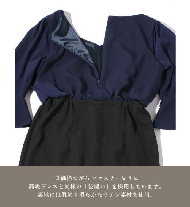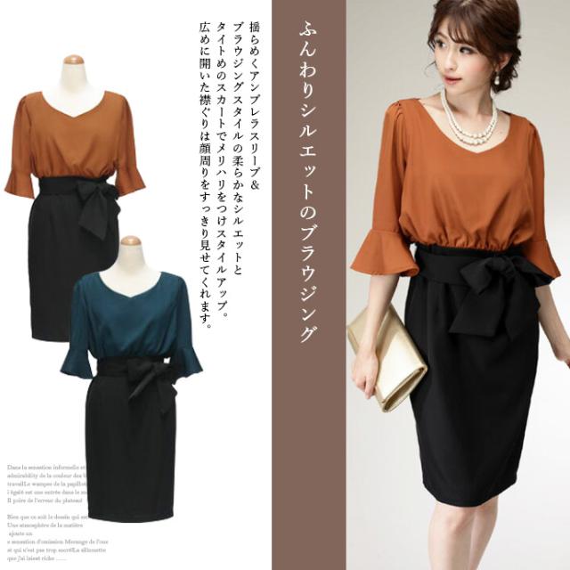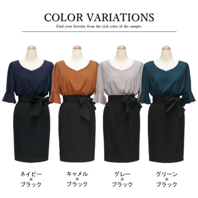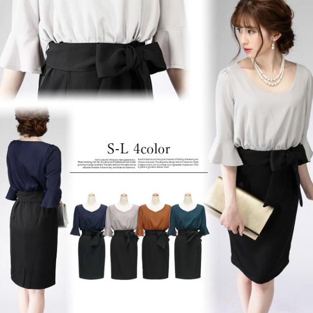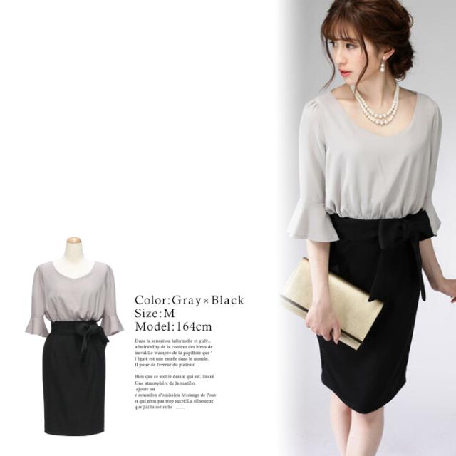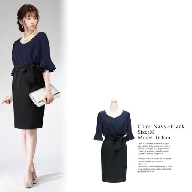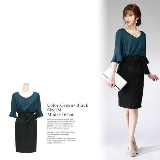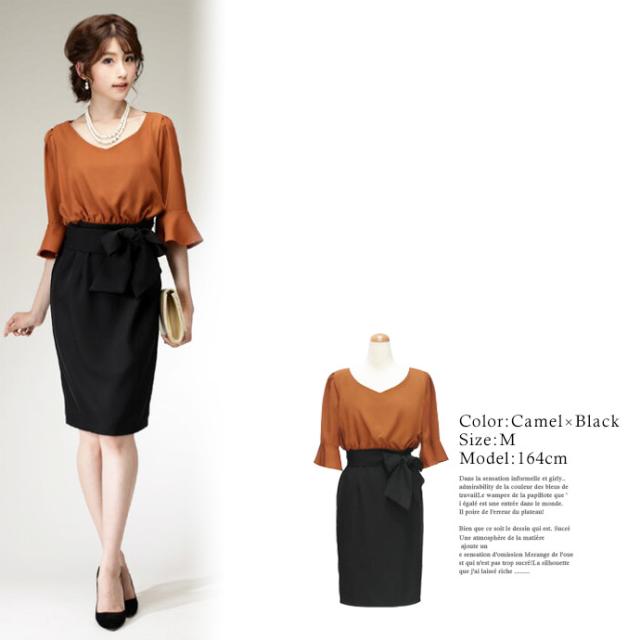 値下げ パーティードレス 披露宴 結婚式 アンブレラスリーブ ブラウジング バイカラー リボンベルト付き 膝丈 ワンピース
