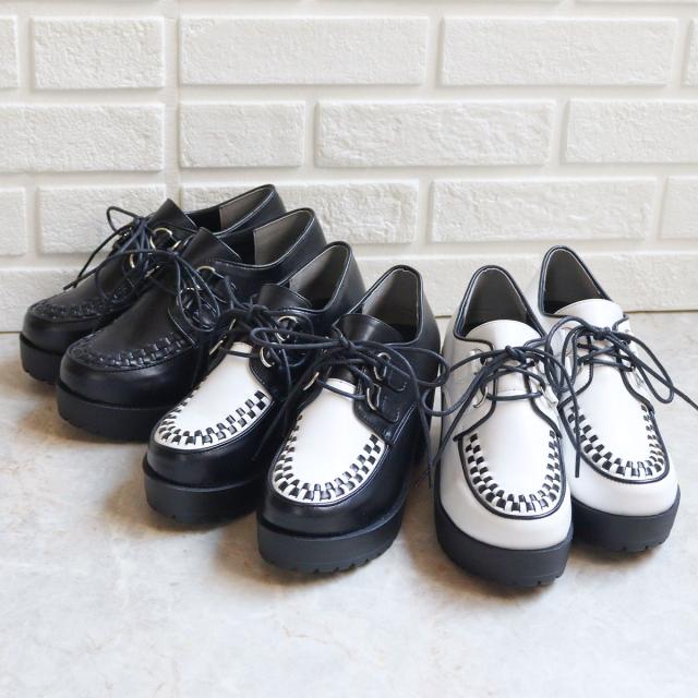甲部分の編み込みがポイントのUチップデザイン厚底シューズ。