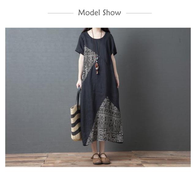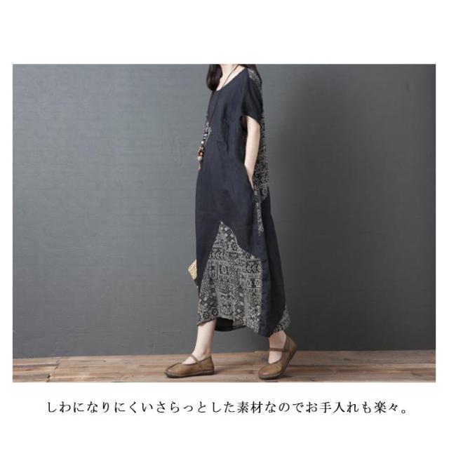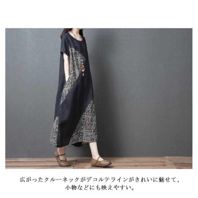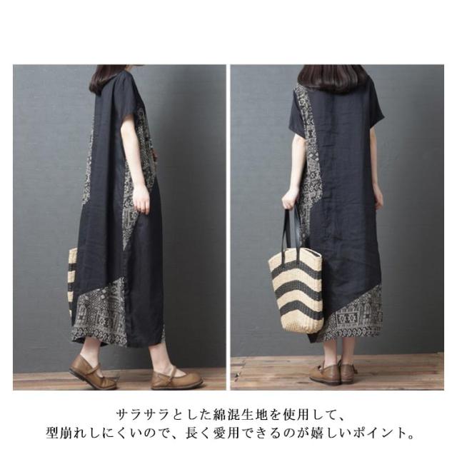 ワンピース マキシワンピース 切り替え 半袖 異素材 エスニック柄 アジアン ゆったり カジュアル おしゃれ ロングワンピース クルーネック ロング丈 レディース 体型カバー きれいめ 大人 女性 可愛い 大きいサイズ 着痩せ 秋 春 夏 ナチュラル ギフト プレゼント 送料無料