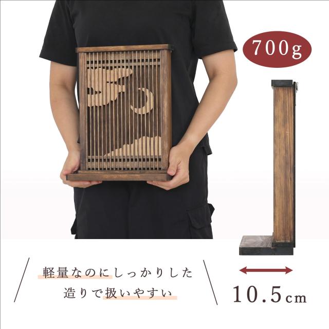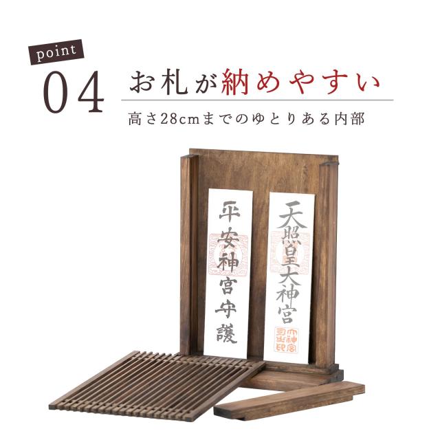 大きいお神札や御朱印帳なども収めやすい作りとなっており、前面が取り外せる構造です。