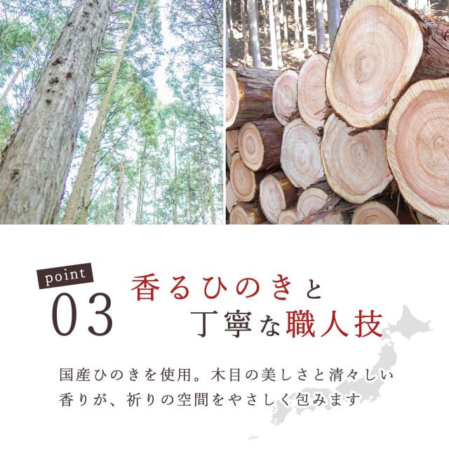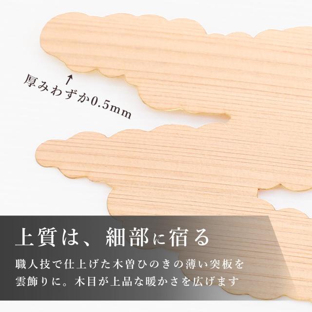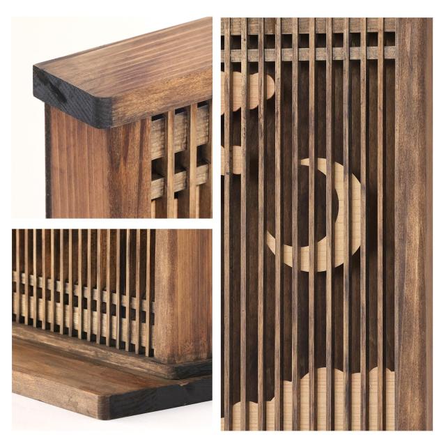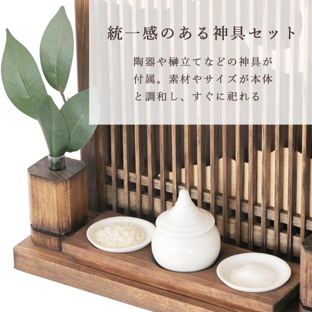 神棚は、和モダン・インテリア ■ 清楚に、立派に祀る 雲を照らし輝く、三日月の宵時。天と地のはざまにアマテラス様の存在と、天地創造の神話を感じて。そんな神々しいストーリーをイメージして、個性的な色付けと和のデザインをしています。雲間の向こうにお神札を収め、手を合わせ柏手を。1〜2枚のお神札を収める際には最適な、とてもコンパクトなサイズです。置いても、壁に掛けても和洋問わずお部屋になじむシルエット。 ■ 神様の近くに色々と 大きいお神札や御朱印帳なども収めやすい作りとなっており、前面が取り外せる構造です。お守りなども、お神札と一緒に納められる奥行があります。 ■ 桧から職人が「造る」 日本建築の美しさ「千本格子」と、薄い木曽桧の「突き板」を装飾に、暖かくやさしい雰囲気の神棚。岐阜県と長野県の県境辺りで産出される、とても良質な桧材は、オイルステイン仕上げにより美しい木目を浮かび上がらせています(背面は合板)。 ■ 清楚な神具にお供えを 素焼きの陶器と桧材で出来た器を組み合わせた、神具一式です。添えれば一層華やかに。自然素材の風合いをたっぷりと、神棚と同じ和モダンカラーに浮かび上がった木目の表情は、一体ごとの個性。神様への願いは、美しい桧の神棚とともに、心を込めて。 |