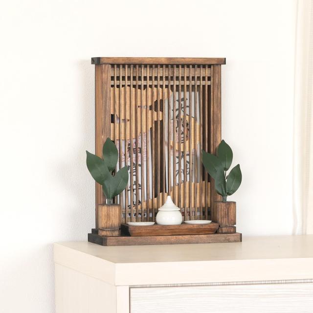「千本格子」と、薄い木曽桧の「突き板」を装飾に、暖かくやさしい雰囲気の神棚。