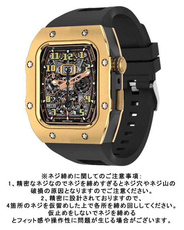 | 頑丈な金属製のケースは、アップルウォッチ本体の傷を防いでくれます。ハイキング等のアウトドアのご利用にもオススメです。 素材には耐熱性・耐食性・耐薬品性の高い亜鉛合金製を採用。強度が高く、少々の衝撃にも強さを発揮します。 濡れたら乾いた布でさっと拭くだけ。汚れても水拭きできるので清潔感が保てます。 付属のラバーケースをアップルウォッチにつけて、ケースにはめた後、ネジで留めるだけの簡単装着です。 ご注意点: 1、Apple Watchの電源を切る後、ケースの中にあるラバーを取り付けます。その際液晶部分に干渉しないようにご注意ください。 2、リューズの溝と溝をしっかり合わせてセットします。※溝がしっかり合っていないとボタンの動作が不可となります。 3、表にラバー等がはみ出していないかを確認します。裏蓋のリューズのくぼみに合わせて蓋をします。※合っていないと動作不可となります。 本体装着方法: 付属のラバーケースをアップルウォッチにつけて、ケースにはめた後、ネジで留めるだけの簡単装着です。 ※ネジ締めに関してのご注意事項: 1、精密なネジなのでネジを締めすぎるとネジ穴やネジ山の破損の原因となりますのでご注意ください。 2、精密に設計されておりますので、4箇所のネジを仮留めした上で各所を締め回ししてください。仮止めをしないでネジを締めるとフィット感や操作性に問題が生じる場合がございます。 | |