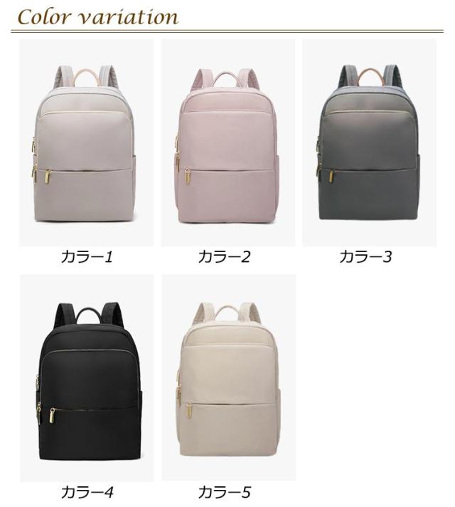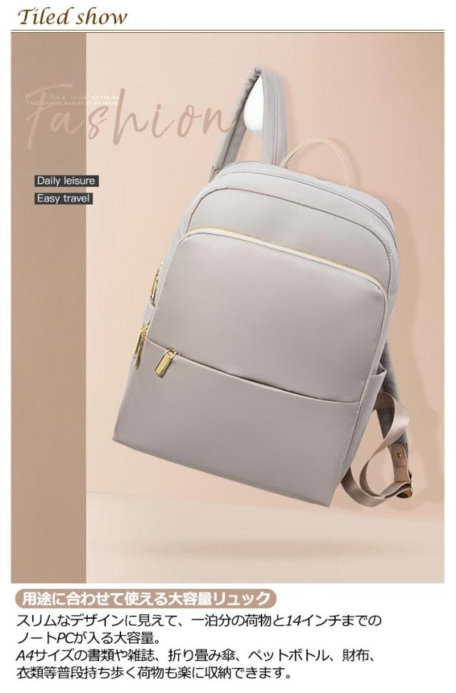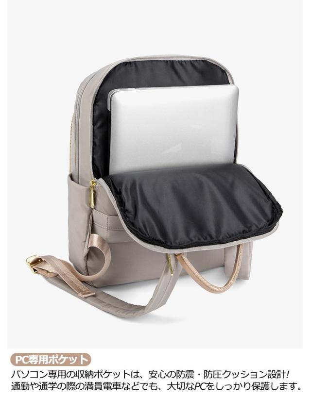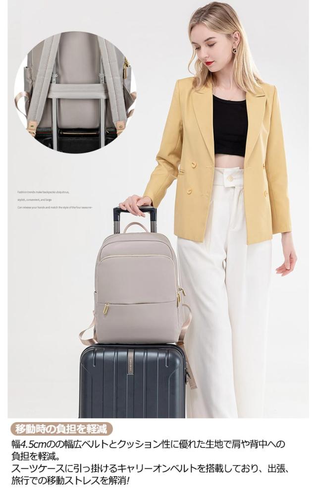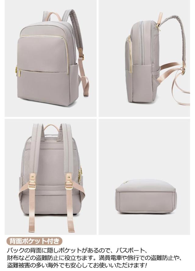 | 【大人可愛い機能的なリュックサック】 通勤や通学などのデイリーはもちろん、旅行用のバッグとしてもオススメ! 【用途に合わせて使える大容量リュック】 スリムなデザインに見えて、一泊分の荷物と14インチまでのノートPCが入る大容量。 A4サイズの書類や雑誌、折り畳み傘、ペットボトル、財布、衣類等普段持ち歩く荷物も楽に収納できます。 【機能的なポケット】 フロント部分、両サイドにはそれぞれポケットがあります。 携帯電話、、財布、iPad、折り畳み傘などサッと取り出して使いたいアイテムを収納するとGOOD! 【背面ポケット付き】 バックの背面に隠しポケットがあるので、パスポート、財布などの盗難防止に役立ちます。 満員電車や旅行での盗難防止や、盗難被害の多い海外でも安心してお使いいただけます! 【PC専用ポケット】 パソコン専用の収納ポケットは、安心の防震・防圧クッション設計! 通勤や通学の際の満員電車などでも、大切なPCをしっかり保護します。 【撥水加工素材】 高品質ナイロン素材に撥水・防汚加工。 水を弾くのに加え、汚れが付きにくいので、突然の雨やうっかりこぼしたコーヒーもサッと一拭きで元通り。 【移動時の負担を軽減】 幅4.5cmのの幅広ベルトとクッション性に優れた生地で肩や背中への負担を軽減。 スーツケースに引っ掛けるキャリーオンベルトを搭載しており、出張、旅行での移動ストレスを解消! 【シンプルデザイン】 シンプルで無駄のない洗練されたデザインとカラーバリエーションが魅力! 年齢を問わず、普段使い、ビジネス、通勤、通学はもちろん旅行バッグとしてなどシーンを選ばずに使用できます。 | |