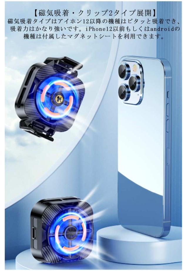 スマホ冷却ファン 2つの冷却モード スマホ 冷却クーラー ペルチェ素子 ファン 磁気吸着/クリップ 半導体 瞬間冷却 USB給電 スマホクーラー 発熱対策 静音 小型 スマホ散熱器 iphone ipad タブレット MagSafe機種適合 幅広い互換性 静音