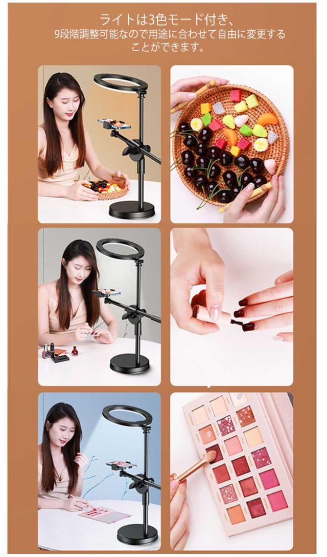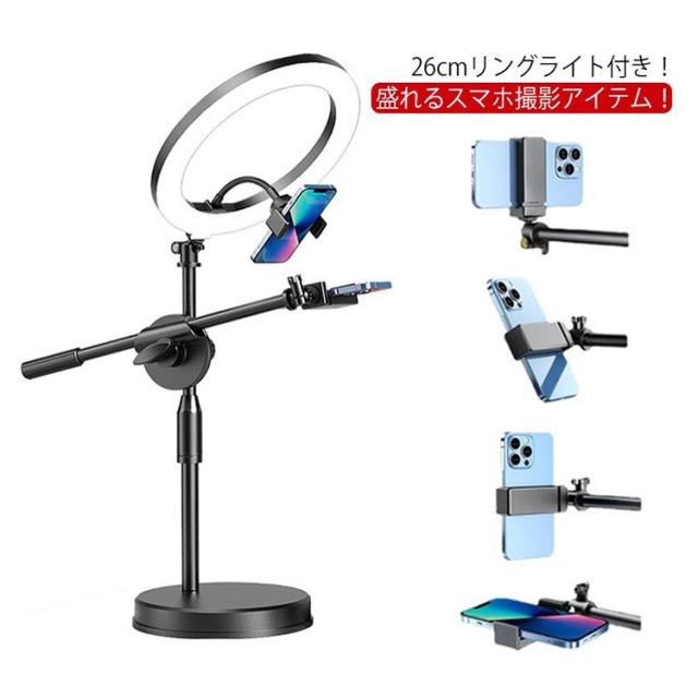 撮影 9段階調整 スタンド 26cm 俯瞰撮影 送料無料 スマホスタンド 手元撮影 ネイル 撮影 LED リングライト付き 真上から撮影 スタンド LEDライト 自撮り 3色モード付き USB 接続 照明ライト 卓上 ライブ配信 実況用 テレワーク