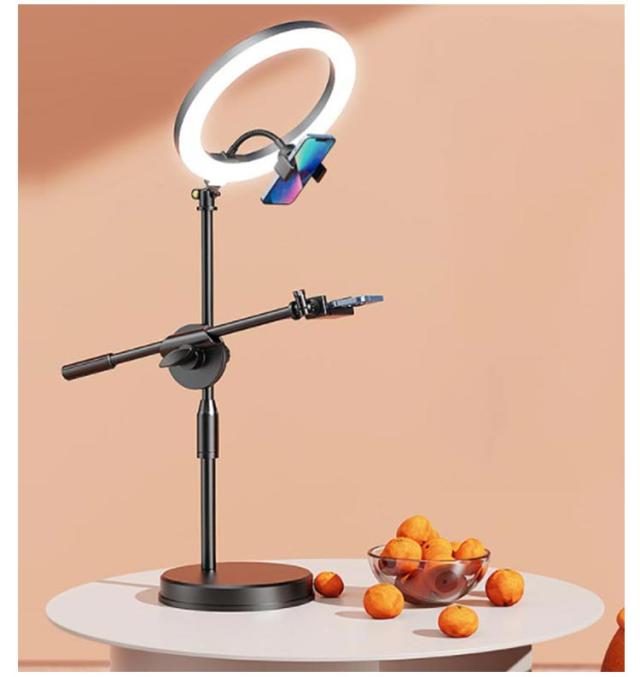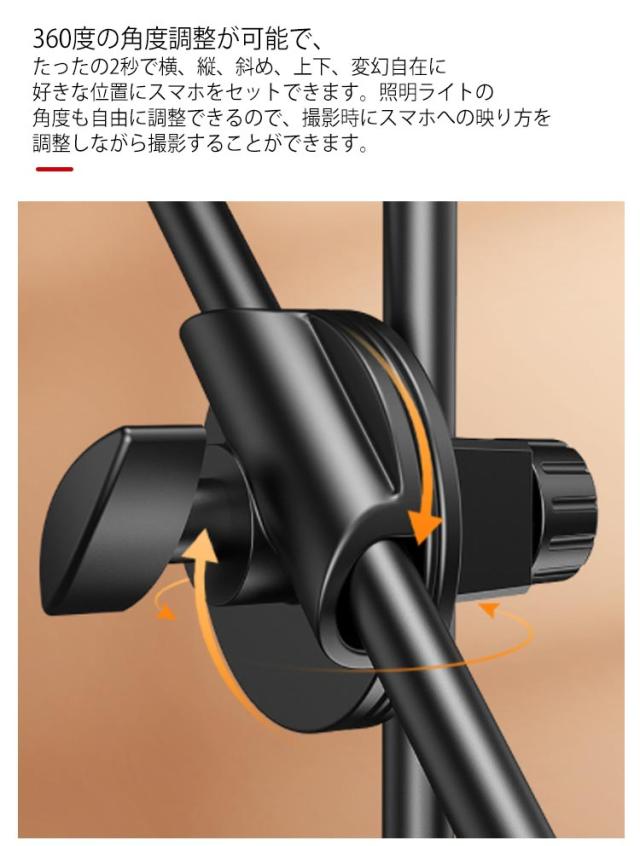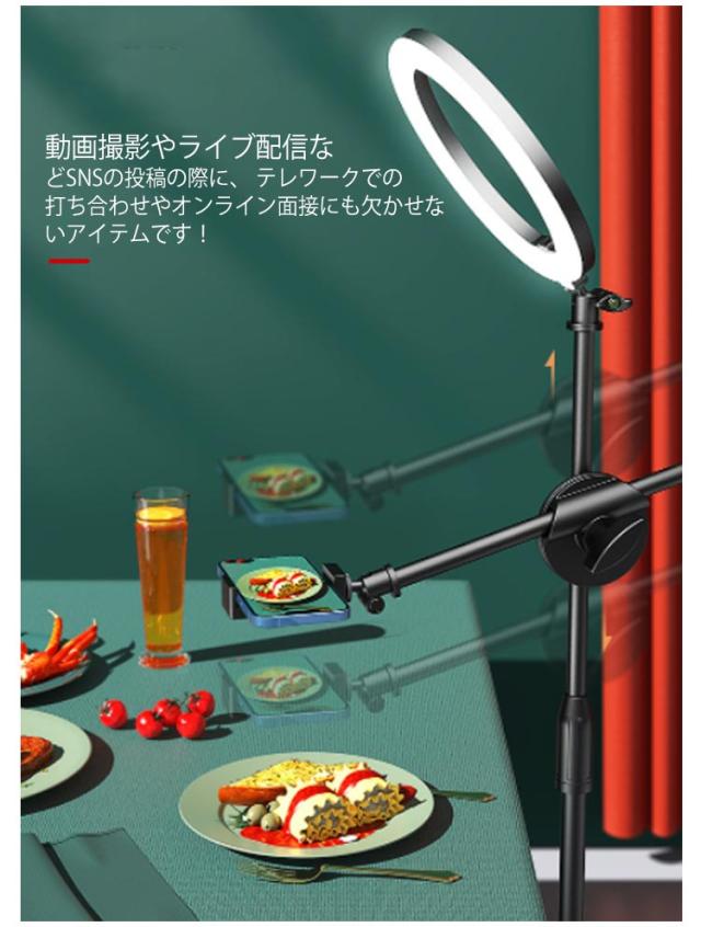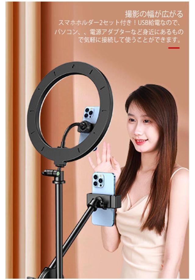 | 26cmリングライト付き!盛れるスマホ撮影アイテム! 動画撮影やライブ配信などSNSの投稿の際に、 テレワークでの打ち合わせやオンライン面接にも欠かせないアイテムです! ライトは3色モード付き、9段階調整可能なので用途に合わせて自由に変更することができます。 撮影の幅が広がるスマホホルダー2セット付き! USB給電なので、パソコン、、電源アダプターなど身近にあるもので気軽に接続して使うことができます。 底面には滑り止めが付いており、ズレにくいので俯瞰撮影にもおすすめです。 360度の角度調整が可能で、たったの2秒で横、縦、斜め、上下、変幻自在に好きな位置にスマホをセットできます。照明ライトの角度も自由に調整できるので、撮影時にスマホへの映り方を調整しながら撮影することができます。 | |