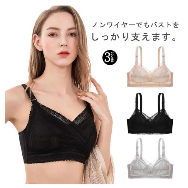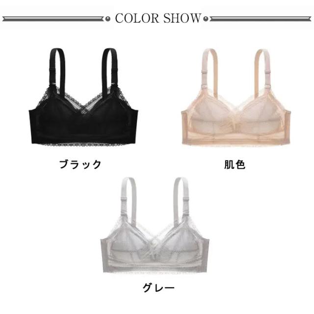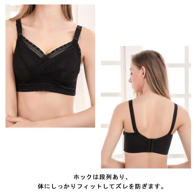 | 上品で可愛らしいレースがポイント ノンワイヤーでもバストをしっかり支えます。 脇や背中に流れるのを防ぎます。 ホックは段列あり、体にしっかりフィットしてズレを防ぎます。 ワイヤーが苦手な方に。 バスト全体をすっぽり覆い、広い範囲でホールドするので、下垂の原因となるユレも抑えます。 | |
