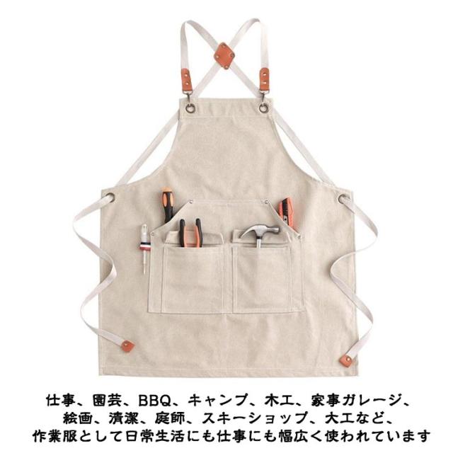 | シンプルに作業用としてお使いいただく事も、アウトドアシーンで料理に使うエプロン キャンバスを採用しており、収縮しにくく、しわになりにくいなどの特性があります、しっかりした、裁縫により丈夫で長持ちできます。 耐熱性や撥水性に優れておりますので、幅広い用途でご使用いただけます エプロンの長さは紐で調節可能です。 十分な量のポケット量。小物類の収納にも最適です。 男女兼用なので幅広い年齢層が着用可能なシンプルなデザインです。 仕事、園芸、BBQ、キャンプ、木工、家事ガレージ、 絵画、清潔、庭師、スキーショップ、大工など、 作業服として日常生活にも仕事にも幅広く使われています | |