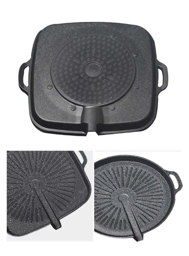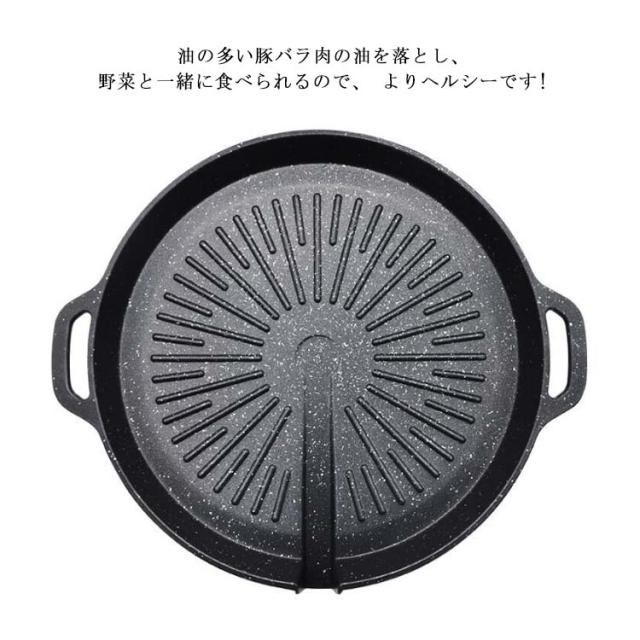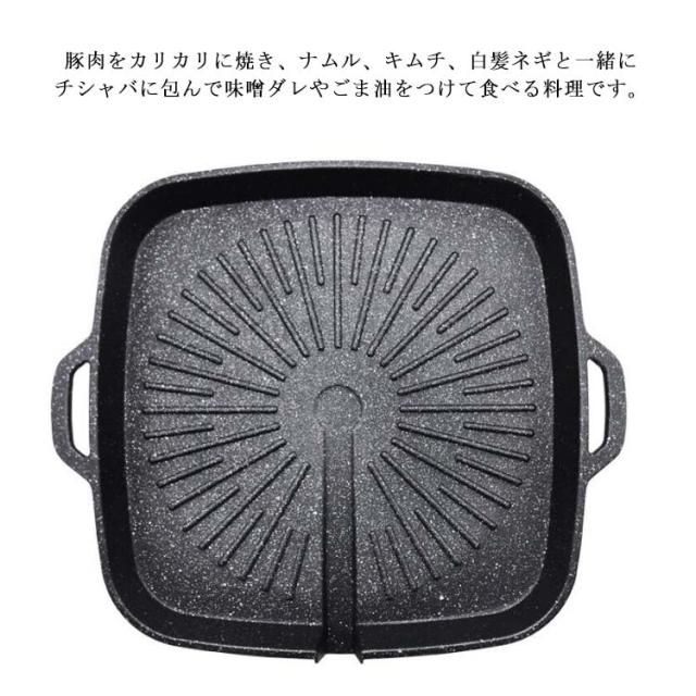 | お肉の余分な油を落とす溝付プレート! 【丸型?角型】【38*38cm】【IH/ガス対応】 集めた油はプレートの外へ流れる設計!(油を溜めないことで野菜を焼く時に油の飛び散りを抑えます) サムギョプサルに最適な焼肉プレート! サムギョプサル→「サム」=数字の3、「ギョプ」=層、「サル」=肉 韓国でポピュラーな豚バラ肉の焼肉料理。 豚肉をカリカリに焼き、ナムル、キムチ、白髪ネギと一緒にチシャバに包んで味噌ダレやごま油をつけて食べる料理です。 油の多い豚バラ肉の油を落とし、野菜と一緒に食べられるので、 よりヘルシーです! | |