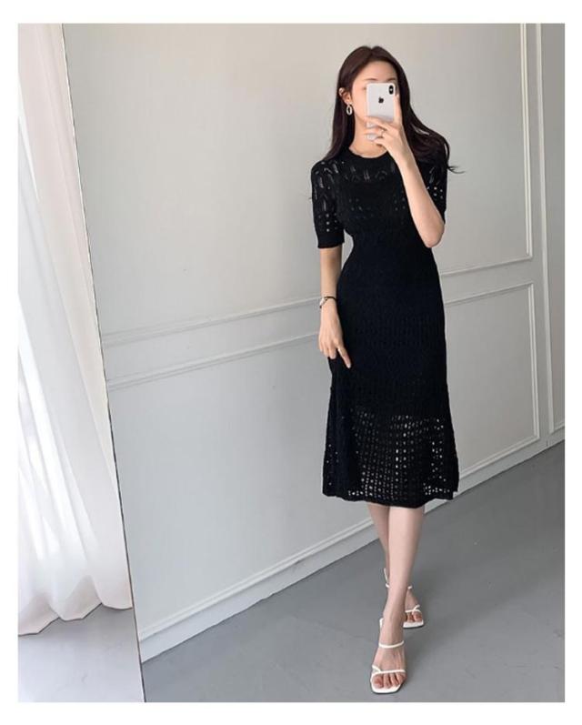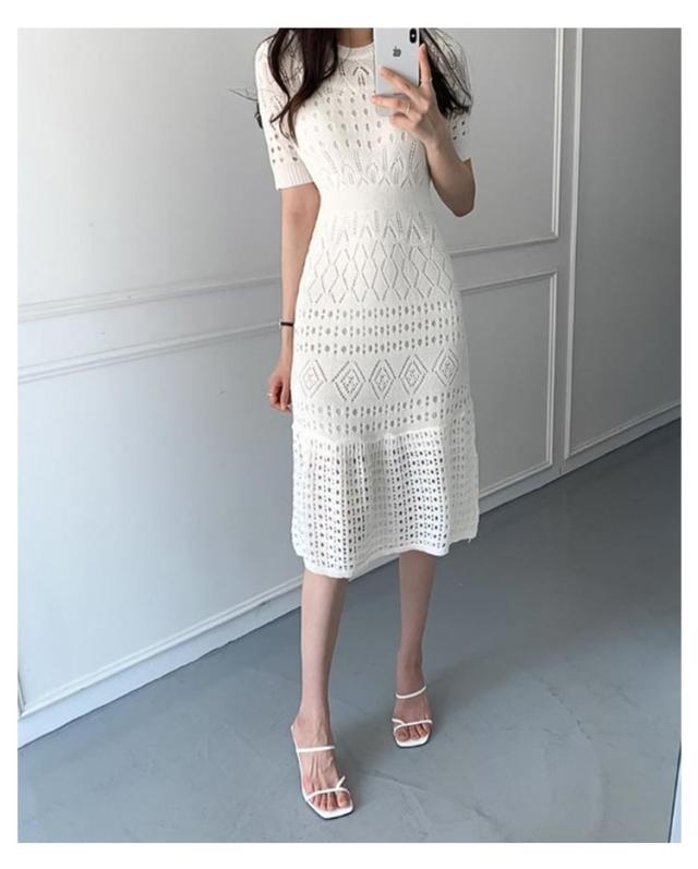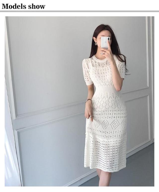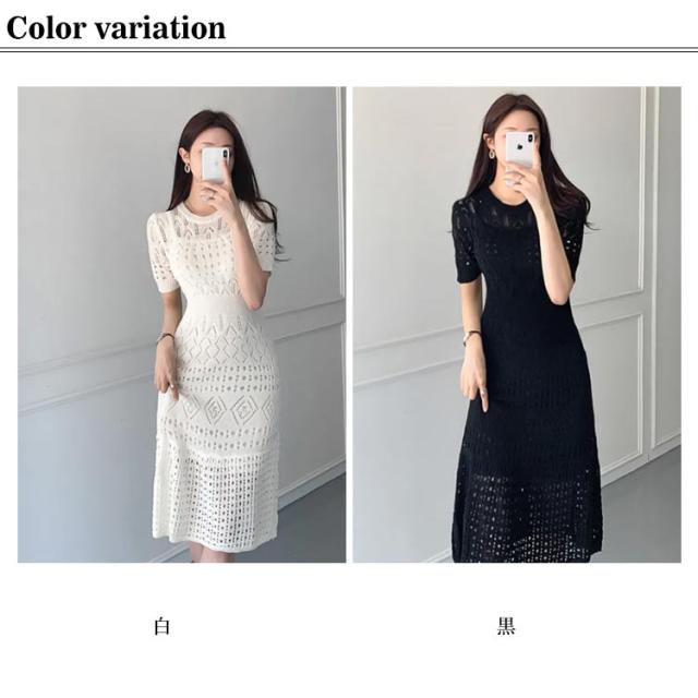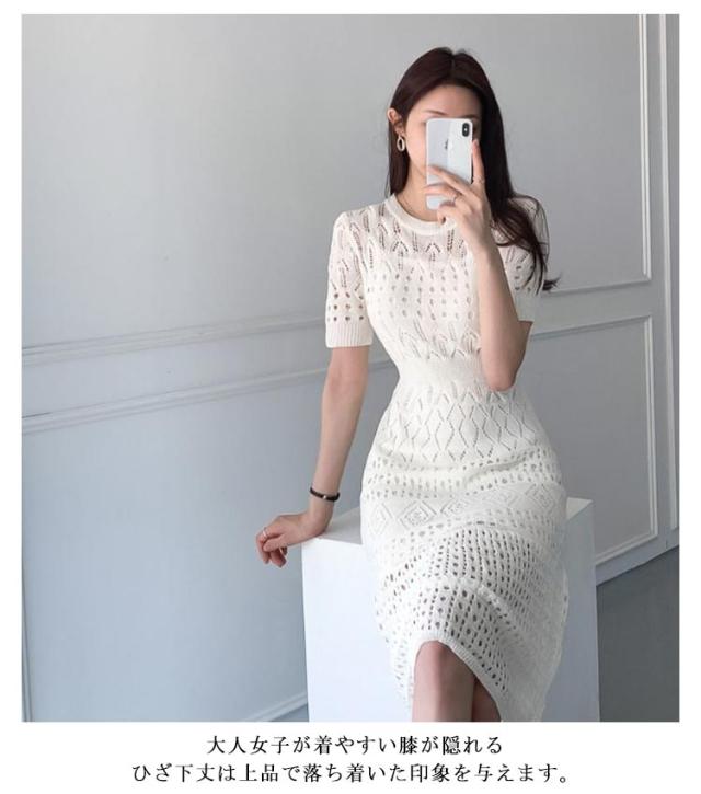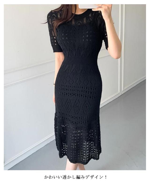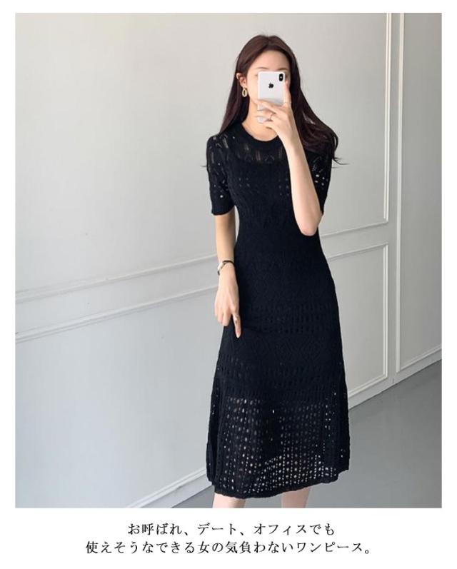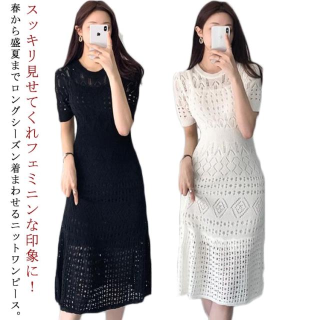 透かし編み ワンピース レディース ニットワンピース 夏 半袖 ロングワンピース サマーニット ニットワンピ 大人 アイスシルク 接触冷感 Aライン フェミニン きれいめ おしゃれ 春夏 20代 30代 40代 S M L XL