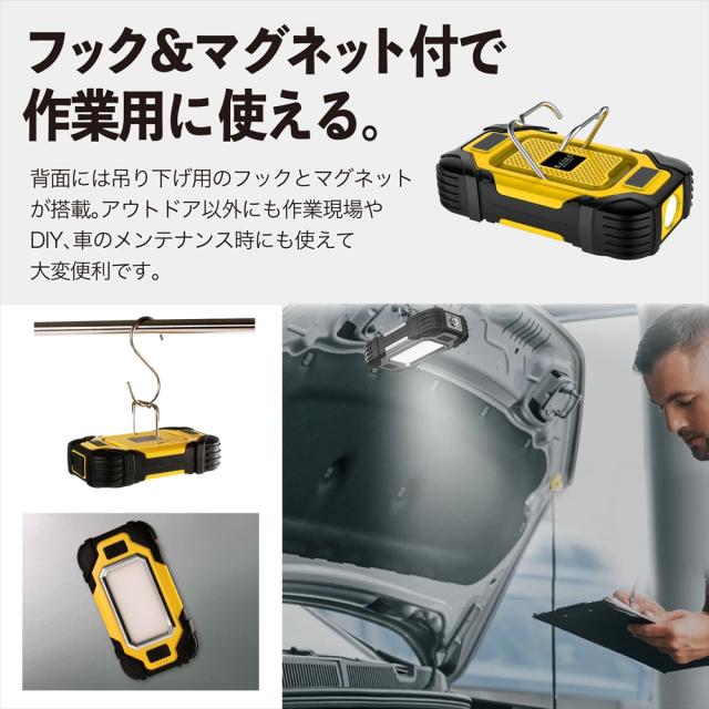 ・背面にはマグネット機能を搭載し、フックも付いているので便利な作業用ライトとしても大活躍。