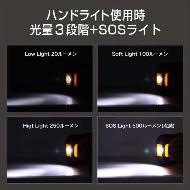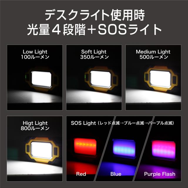 ・デスクライトモード(最大800ルーメン)、ハンドライトモード(最大500ルーメン)の2パターンで使用できるLEDライト。