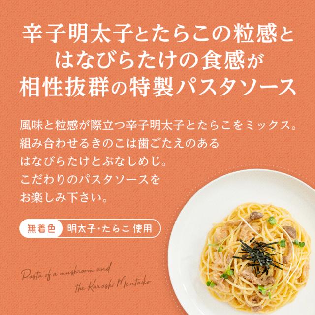 風味と粒感が際立つ辛子明太子とたらこをミックス。組み合わせるきのこは歯ごたえのあるはなびらたけとぶなしめじ。こだわりのパスタソースをお楽しみください。