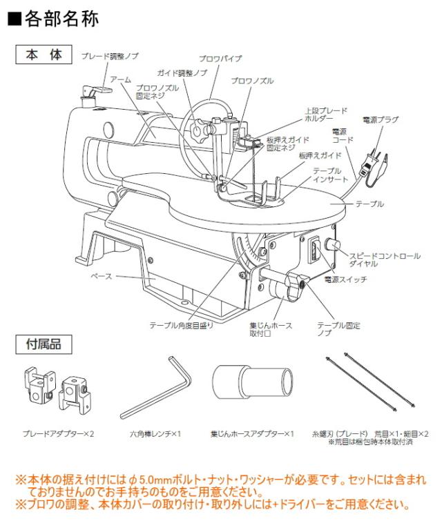 ●バキュームアダプター ●T型六角棒レンチ3mm ●糸鋸刃 3本(荒目・細目) 本体に1本 |