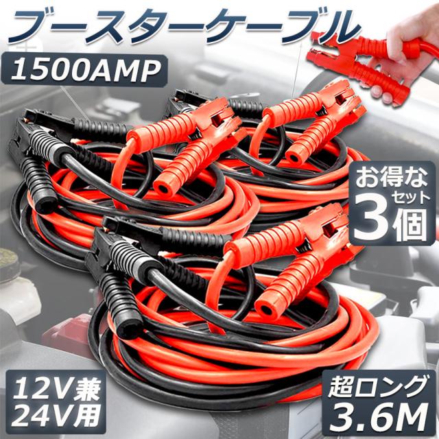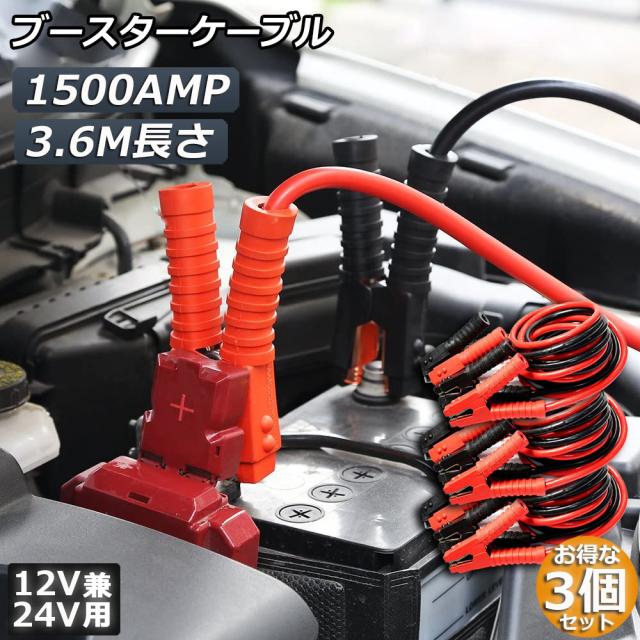 ブースターケーブル ジャンパーケーブル 3.6M 3台セット ロングサイズ 1500A 安全性 耐久性 耐熱防寒 幅広い車種 12V/24 バッテリー上がり 電気 緊急 軽自動車 普通車 ワニ口クリップ