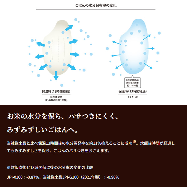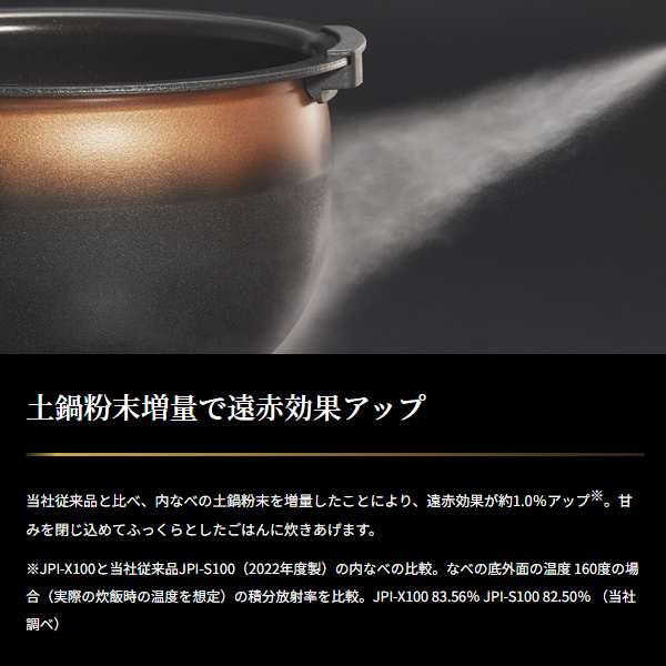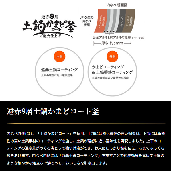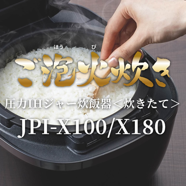 土鍋素材のコーティングを施し、土鍋の理想に近い蓄熱性を再現 ■品番:JPI-X180 ■定格電圧:100V ■定格周波数:50-60Hz ■加熱方式:圧力IH ■白米の炊飯及び保温米飯容量 0.18-1.8L 1合-1升 ■容量:1.8L ■定格消費電力:1350W ■最大炊飯容量区分:D ■年間消費電力量:140kWh/年 ■1回当りの炊飯時消費電力量:237Wh/回 ■1時間当りの保温時消費電力量:22.8Wh/時 ■サイズ 幅×奥行×高さ(約):27.5×32.9×24.2(cm) ■ふた開き時の高さ (約):49.80(cm) ■質量 (約):6.5kg ■省エネ基準達成率:100% ■ラベル: 目標年度2008年度 ■コードの長さ(約):1m ■生産国:日本 ※記載は商品仕様の一部です。仕様説明不足等の理由での返品はできません。特に適合等は必ずご確認ください。