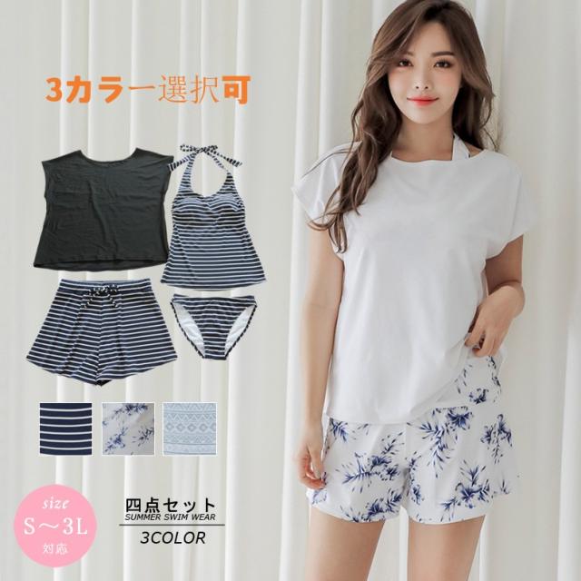 レディース 水着 体型カバー 4点セット 20代 30代 40代 ママ水着 クロップド丈 UPF50+ おしゃれ かわいい 水着 女性用セパレート水着4点セット