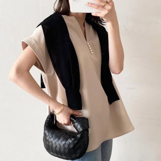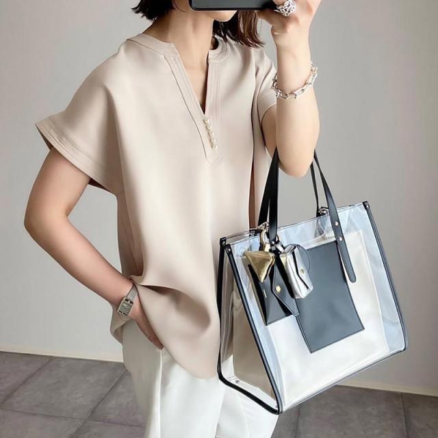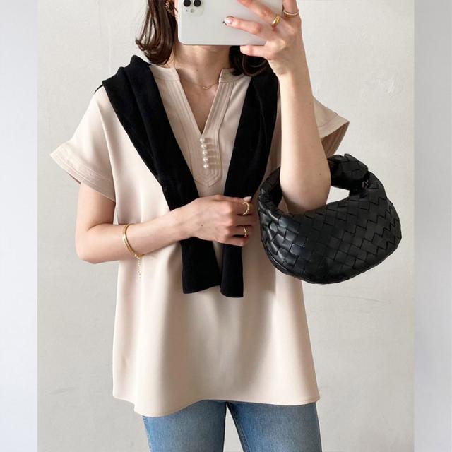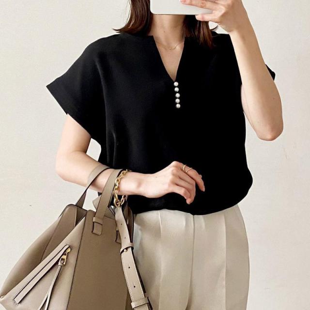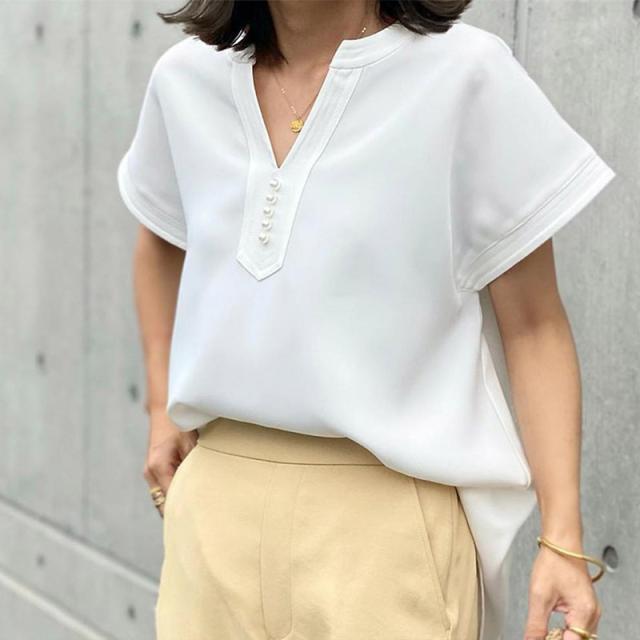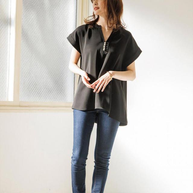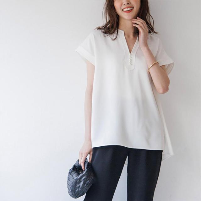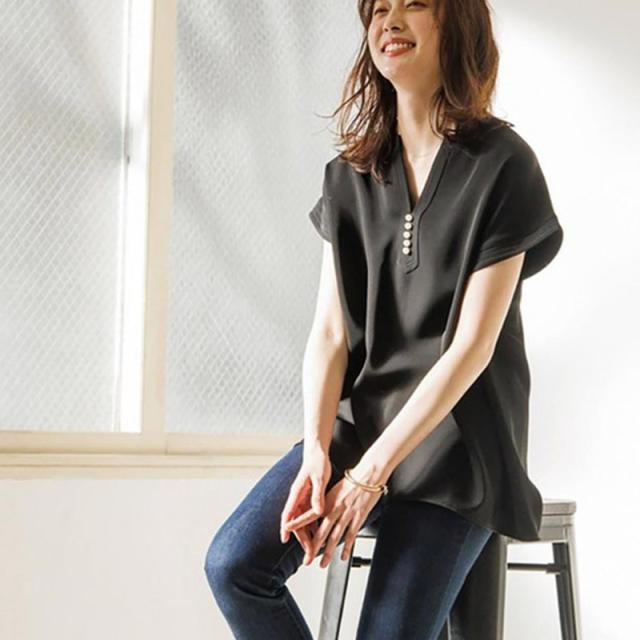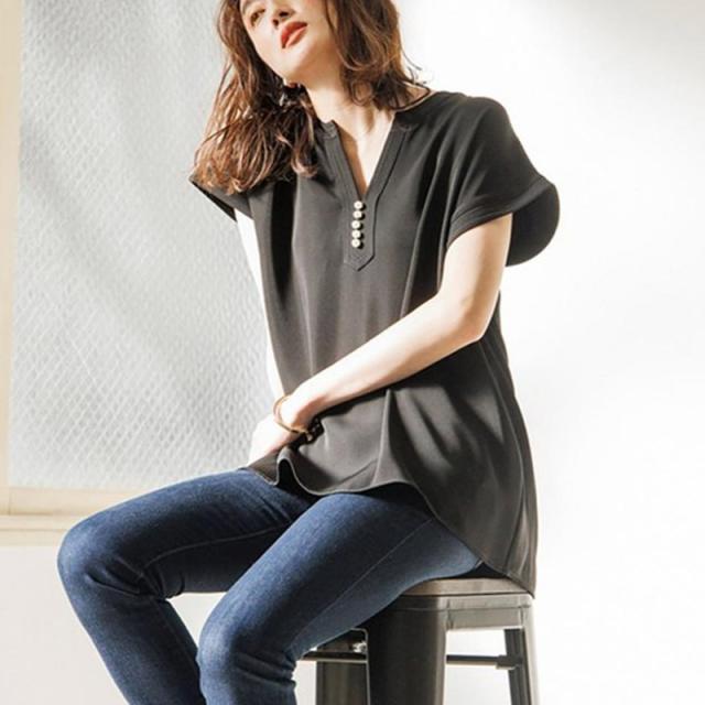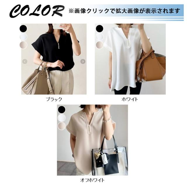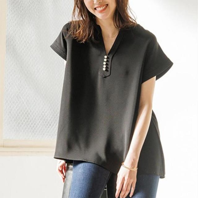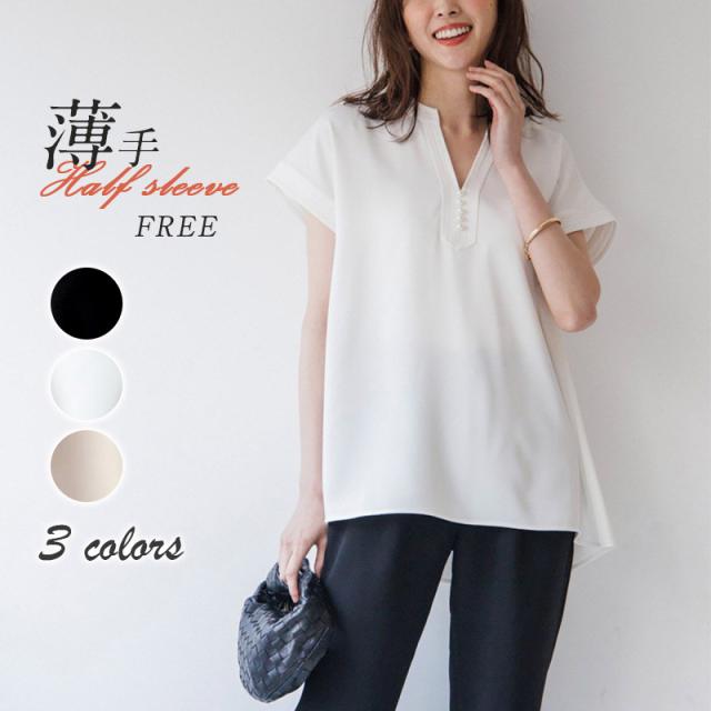 シャツ ブラウス 接触冷感 イージーケア パール釦キーネックブラウス お尻隠す Vネック 5分袖 無地 ゆったり おしゃれ 形状記