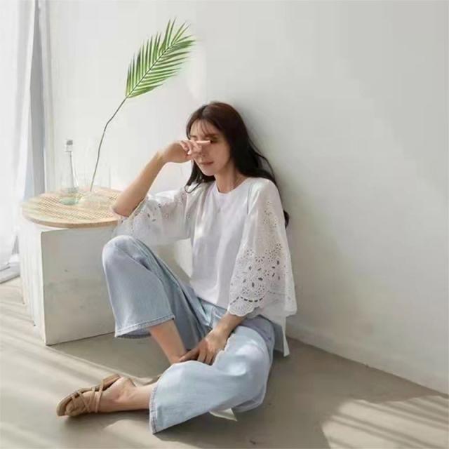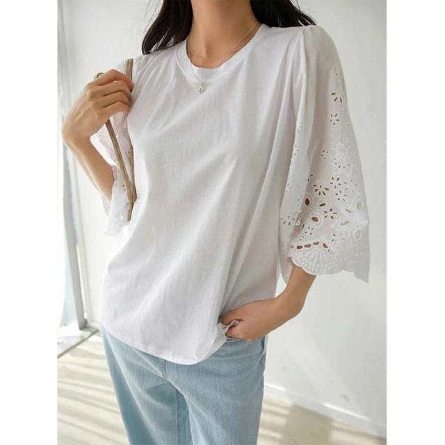 レース トップス 刺繍 ブラウス 半袖 総レース シースルー シャツ ブラウス 接触冷感 袖フレア 5分袖 可愛い ゆったり おし