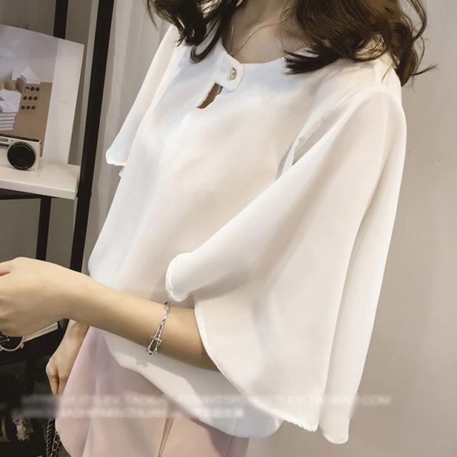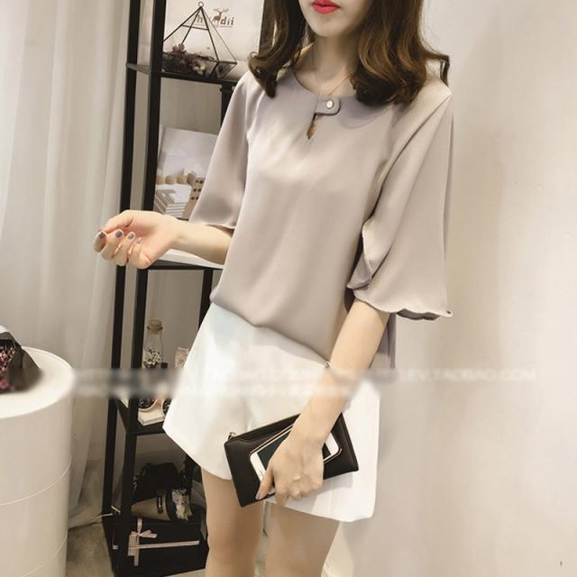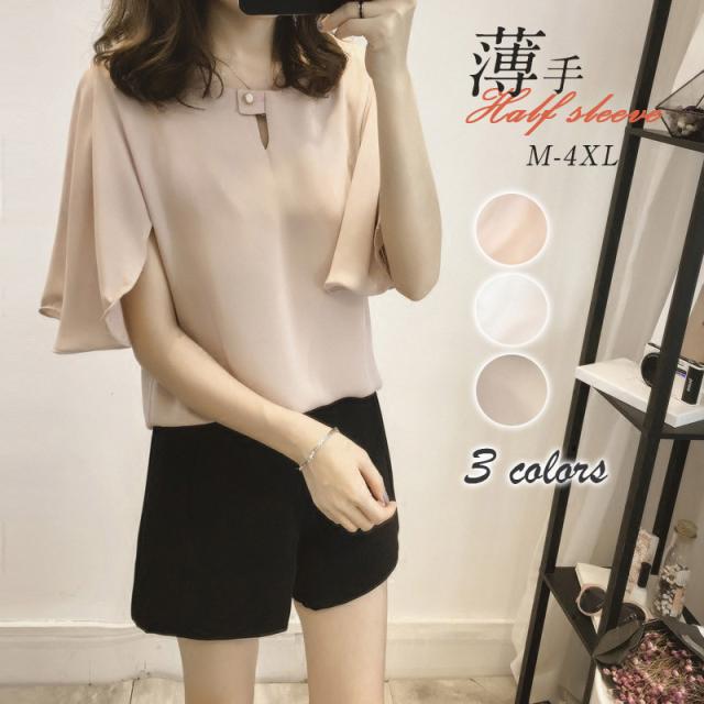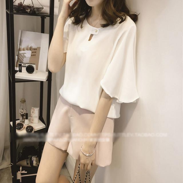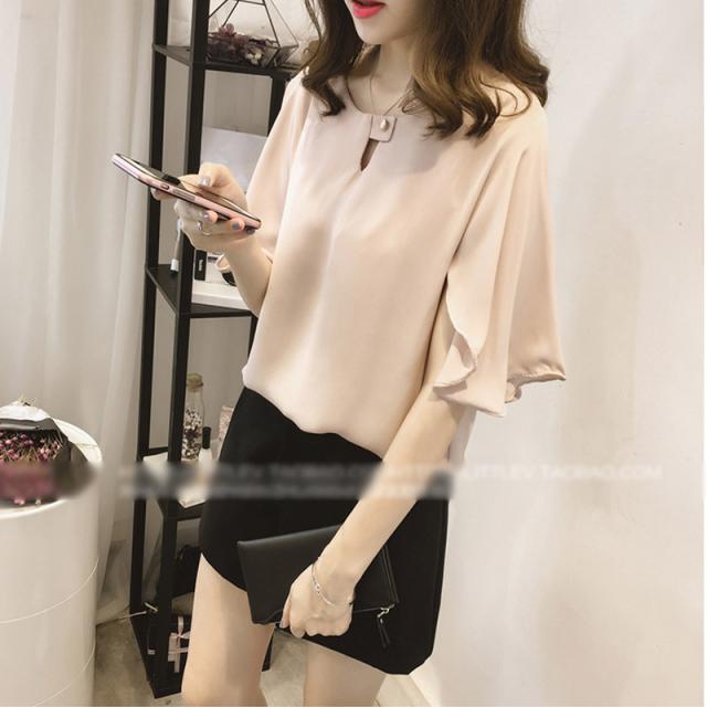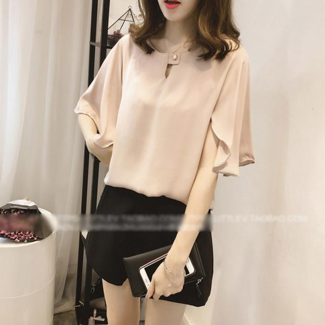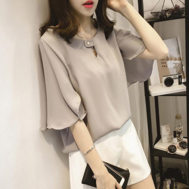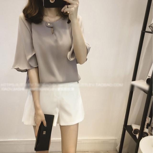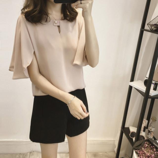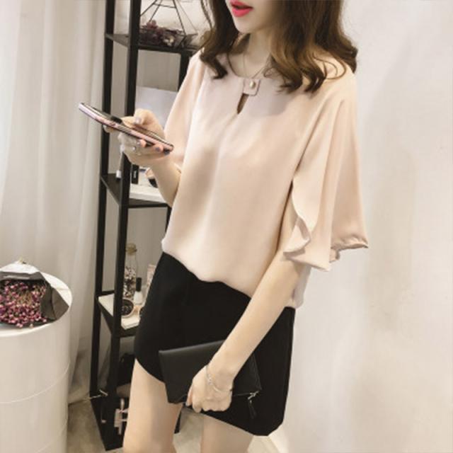 抜け感があるシルエットが魅力の半袖シフォンブラウス。
