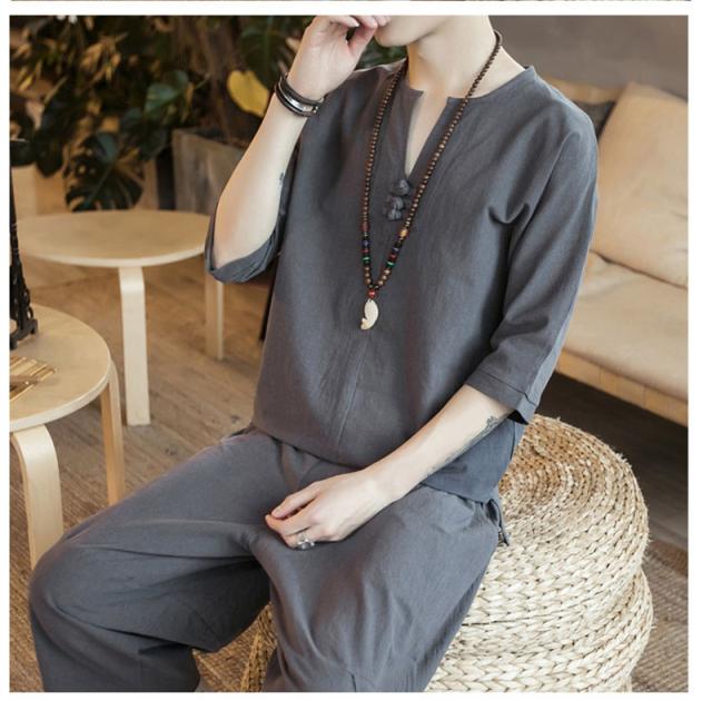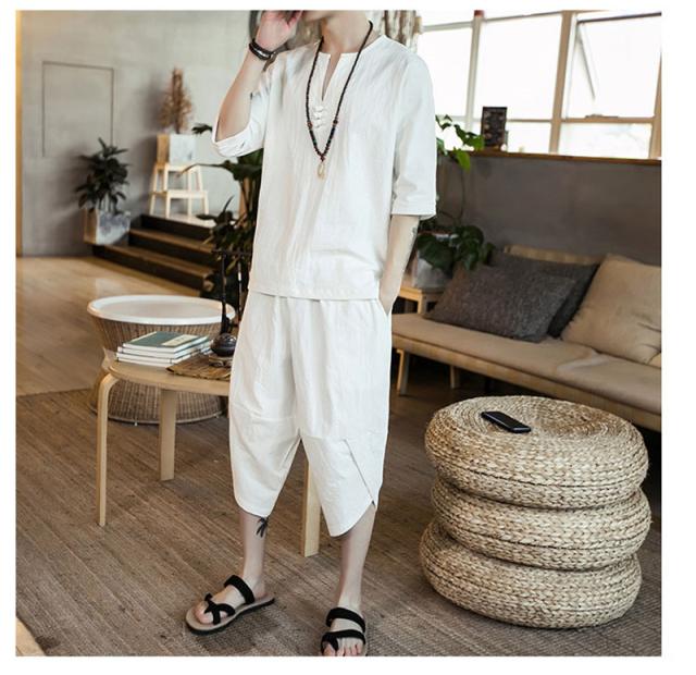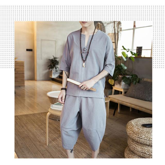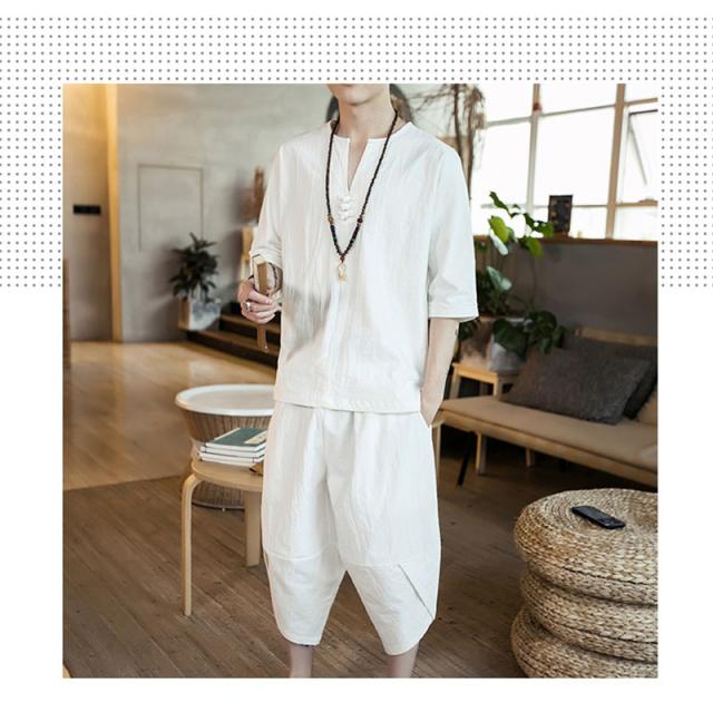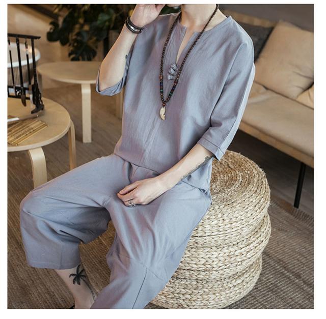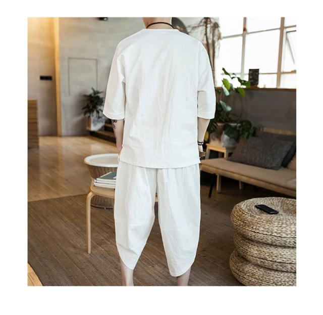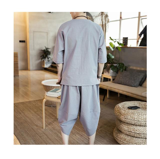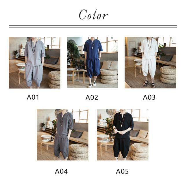 セットアップ 綿麻 メンズ 半袖 リネンシャツ サルエルパンツ 上下セット Tシャツ 半ズボン 7分丈 無地 ルームウェア 部屋着