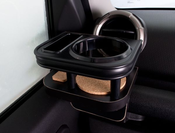 乗り始めて思う「純正ドリンクホルダー」の使いにくさ。純正ドリンクホルダーにドリンクを置いて運転するのは少し危険です。そこで!使いやすさを重視した専用タイプのドリンクホルダーを開発。エアコンからの冷風/温風でドリンクの保冷もOK!カラーを室内色に合わせブラックに統一し、後付感を軽減。純正のボルト穴を使用し付属の専用ボルトで固定するため、加工も一切必要ありません。