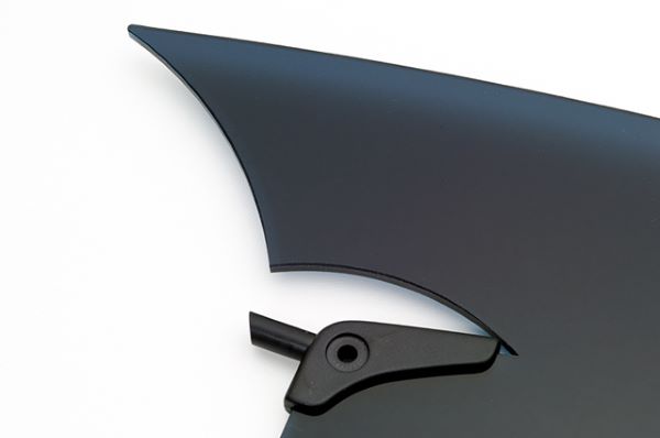 純正ロールバー形状に合わせたスモークリアディフレクター。特徴的なデビルデザインは注目度が高いだけでなく、夜間走行中の後方車両ヘッドライト光を防眩できる形状設計。