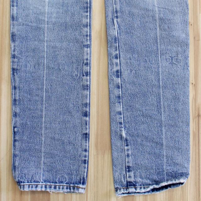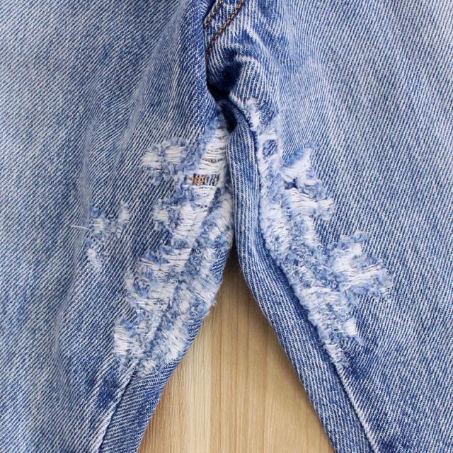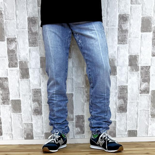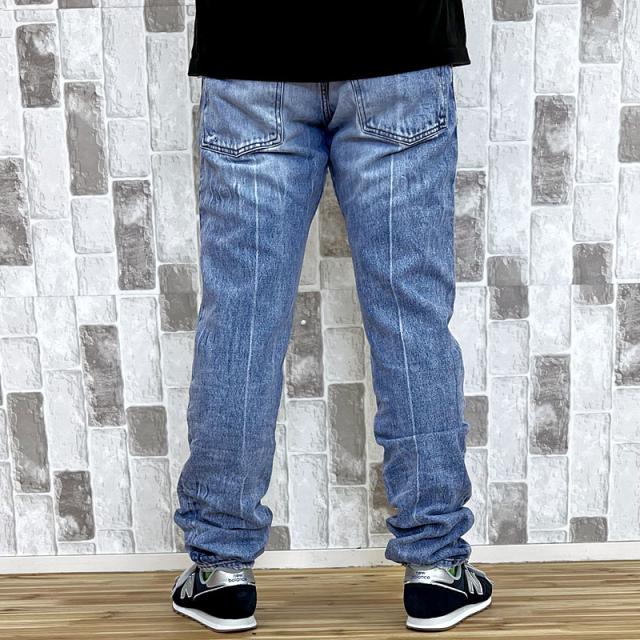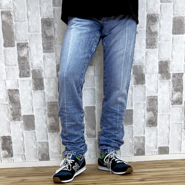 全体的にウォッシュ加工を施た色落ち感とセンタープレスが特徴。
