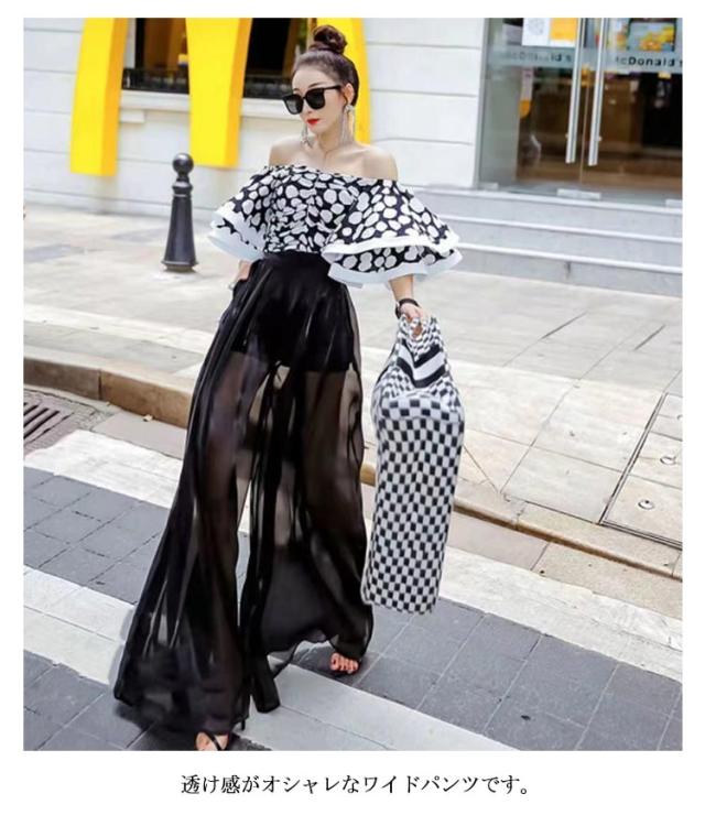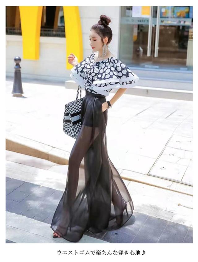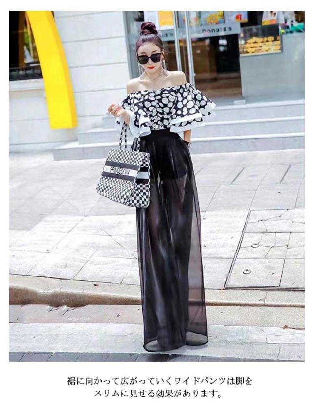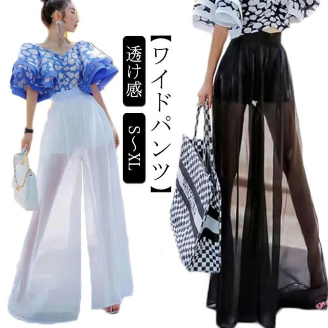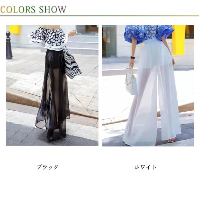 パンツ レディース ワイドパンツ 透け感 ガウチョパン 美脚効果 スカーチョ 大きいサイズ ボトムス ロングパンツ きれいめ シフォン ハイウエスト 春 夏 ズボン パラッツォパンツ シアー 体型カバー 黒 フレア ブラック ホワイト ワインレッド 白 薄手