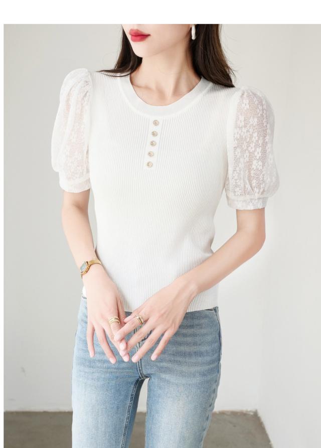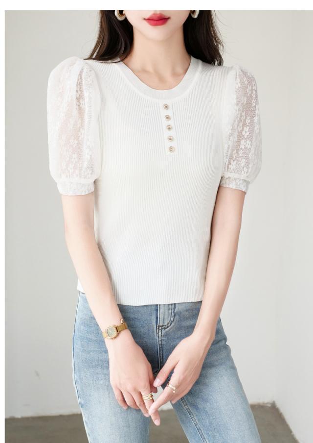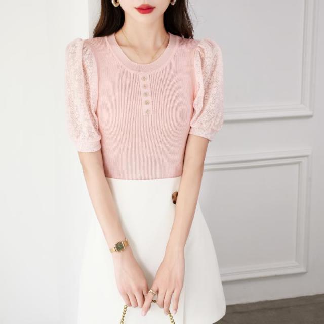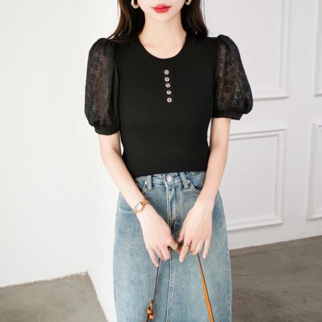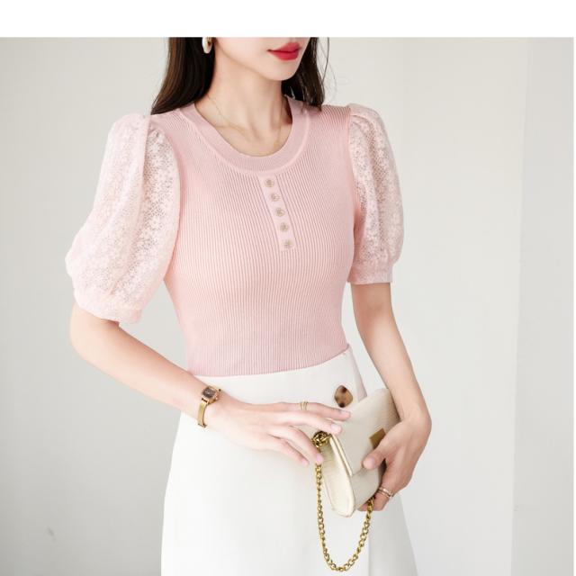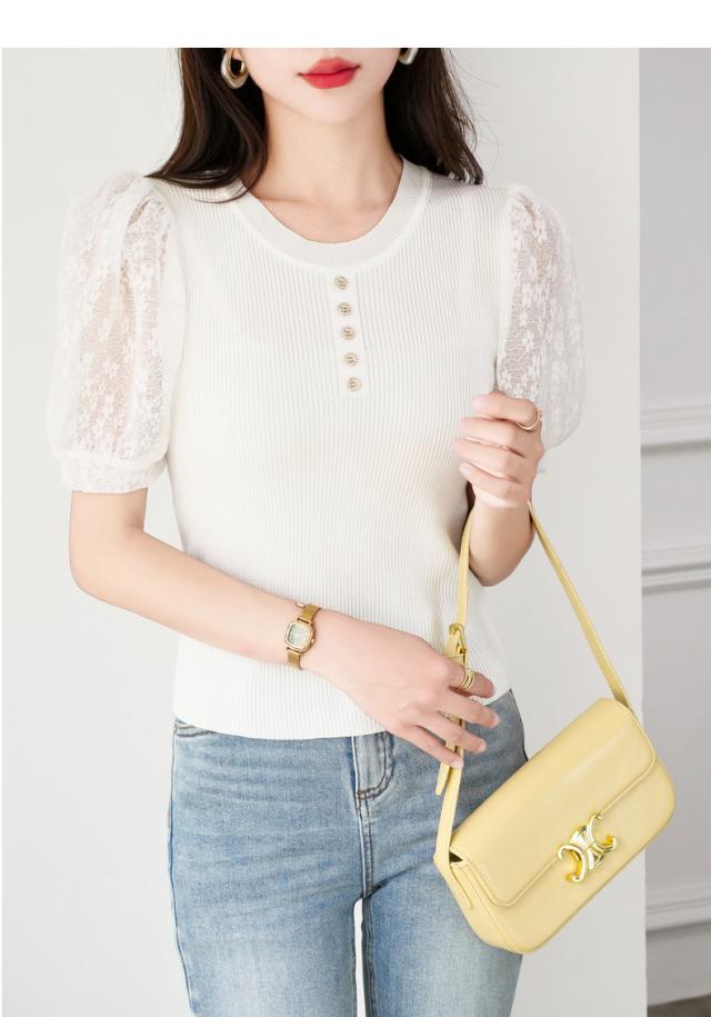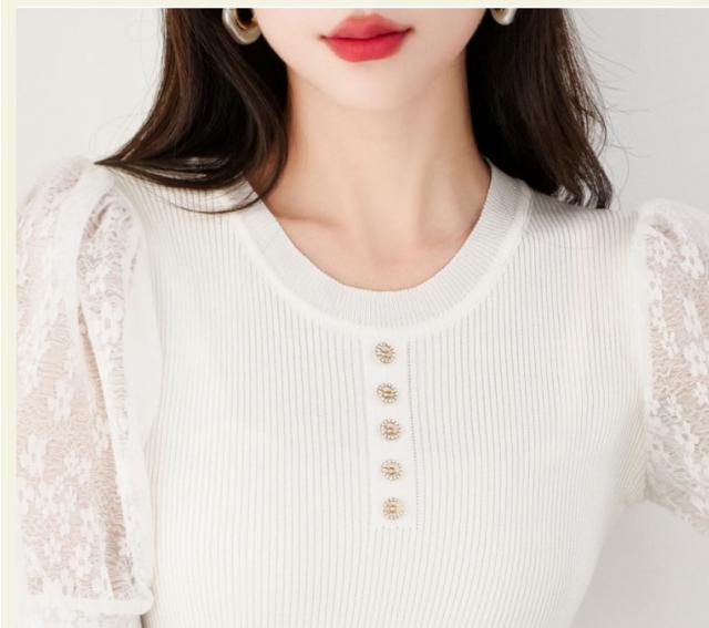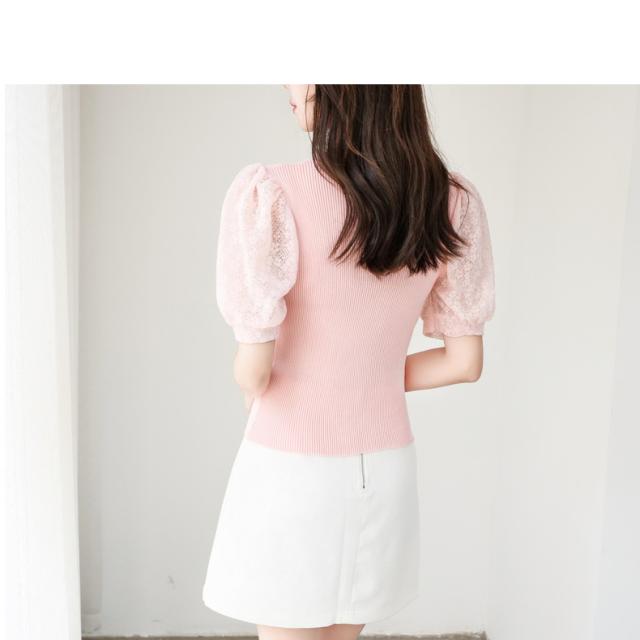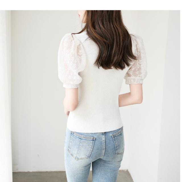 サマーニット レディース 半袖 レース パフスリーブ 花柄 シースルー カットソー Tシャツ ニットトップス 夏 可愛い きれいめ