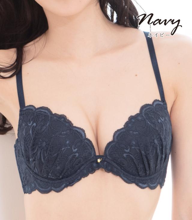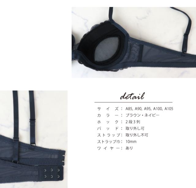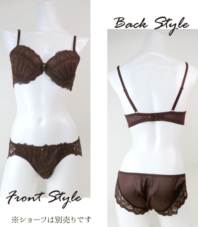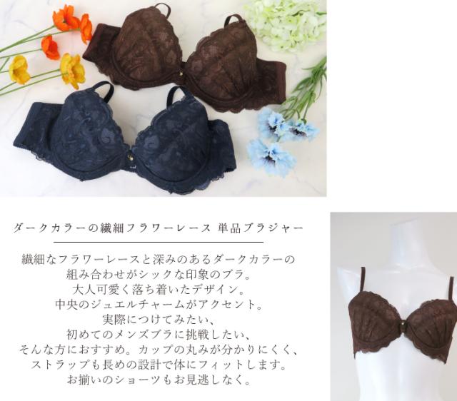 繊細なフラワーレースと深みのあるダークカラーの組み合わせがシックな印象のブラ。大人可愛く落ち着いたデザイン。中央のジュエルチャームがアクセント。実際につけてみたい、初めてのメンズブラに挑戦したい、そんな方におすすめ。カップの丸みが分かりにくく、ストラップも長めの設計で体にフィットします。お揃いのショーツもお見逃しなく。