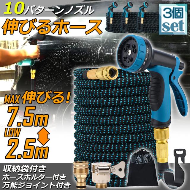 ホース 散水ホース 伸びるホース 3個セット ホースリール 伸縮ホース 洗車ホース 3倍に伸びる 10パターンノズル 超軽量 伸びるホースノズル 散水ノズル コンパクト収納 洗車 ガーデニング 庭 ベランダ 玄関 散水 大掃除 収納袋 付き
